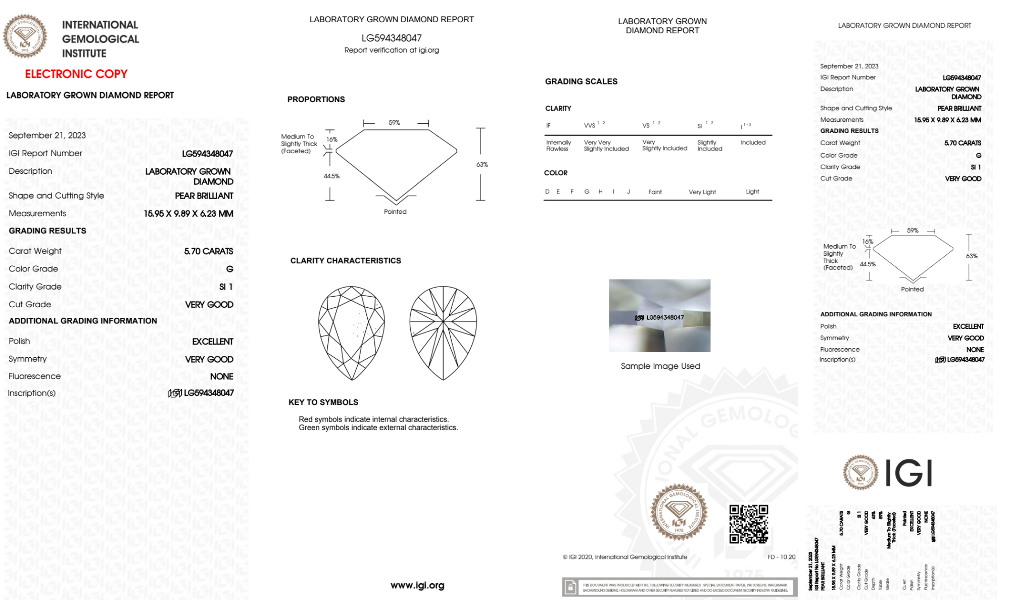 Your 5.70 carat Pear lab diamond is graded G color (Near Colorless), and you can read more about G color diamonds here.
