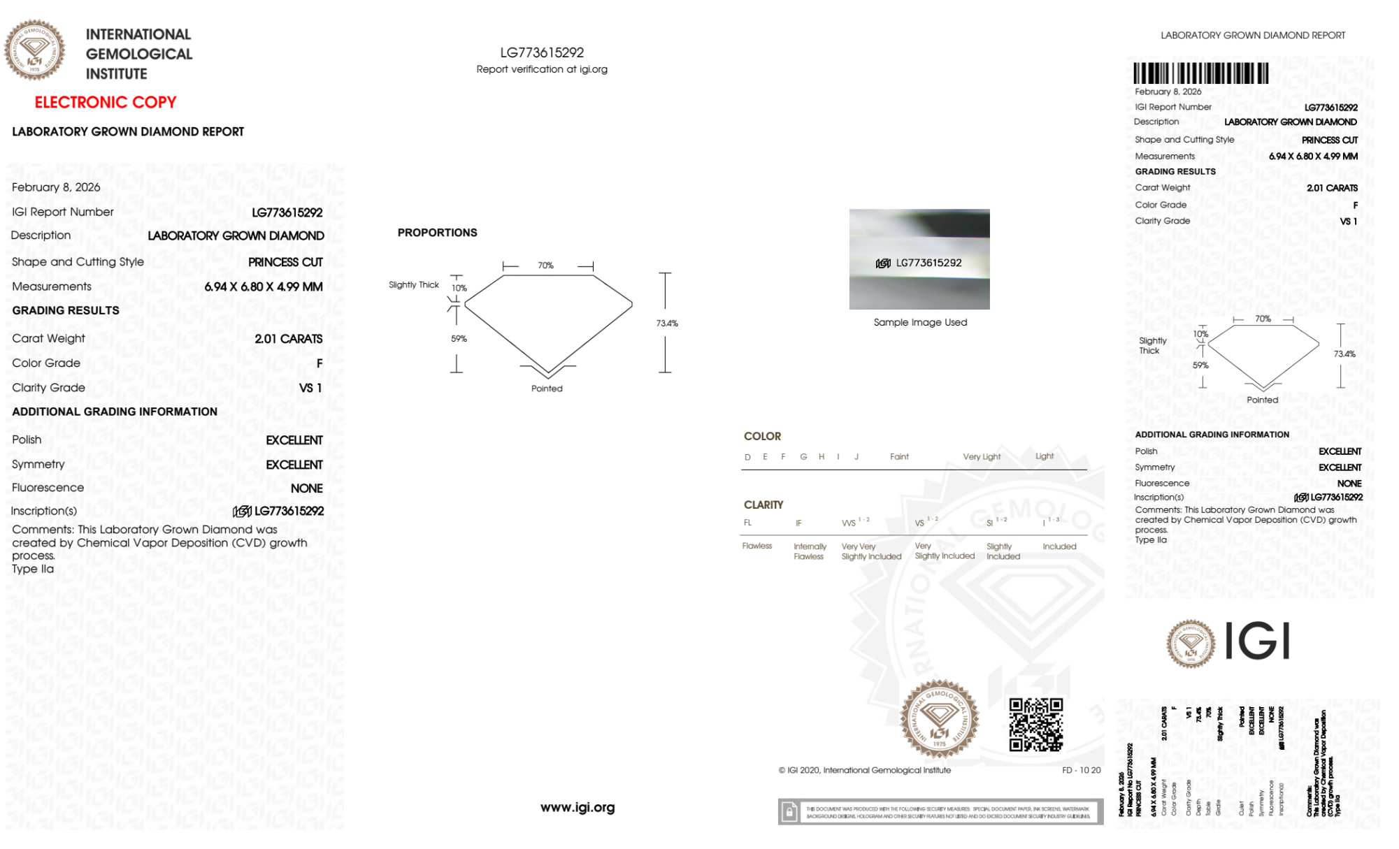 Your 2.01 carat Princess lab diamond is graded F color (Colorless), and you can read more about F color diamonds here.