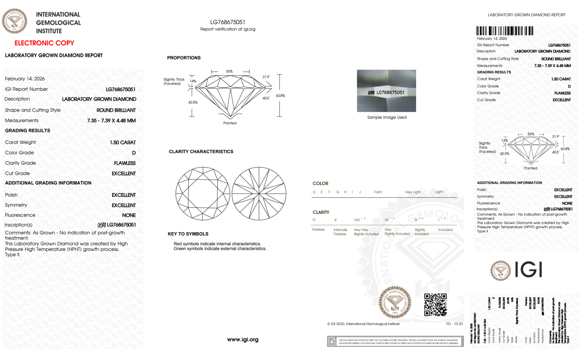 Your 1.50 carat Round lab diamond is graded FL clarity, which stands for Flawless. Read more about FL clarity diamonds here, or learn more about diamond clarity in general here.