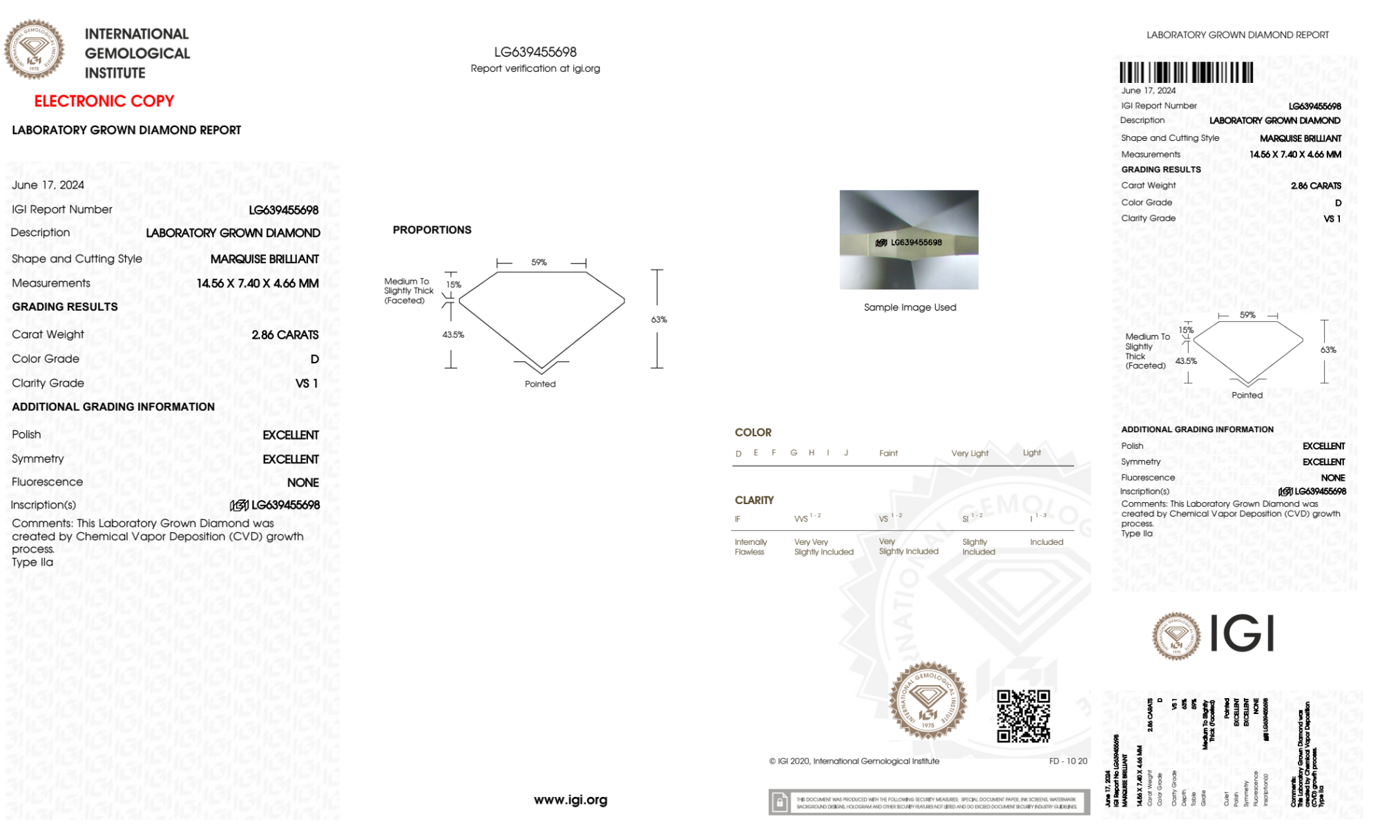 Your 2.86 carat Marquise lab diamond is graded D color (Colorless), and you can read more about D color diamonds here.