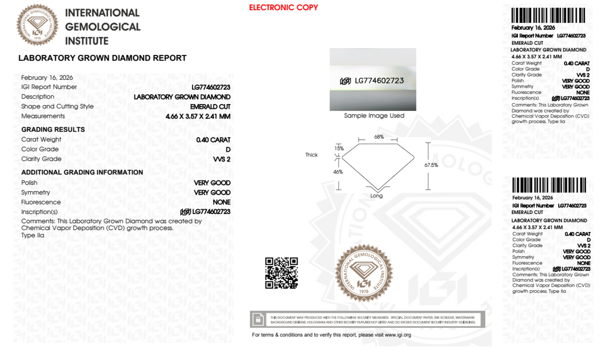 Your 0.40 carat Emerald lab diamond is graded D color (Colorless), and you can read more about D color diamonds here.