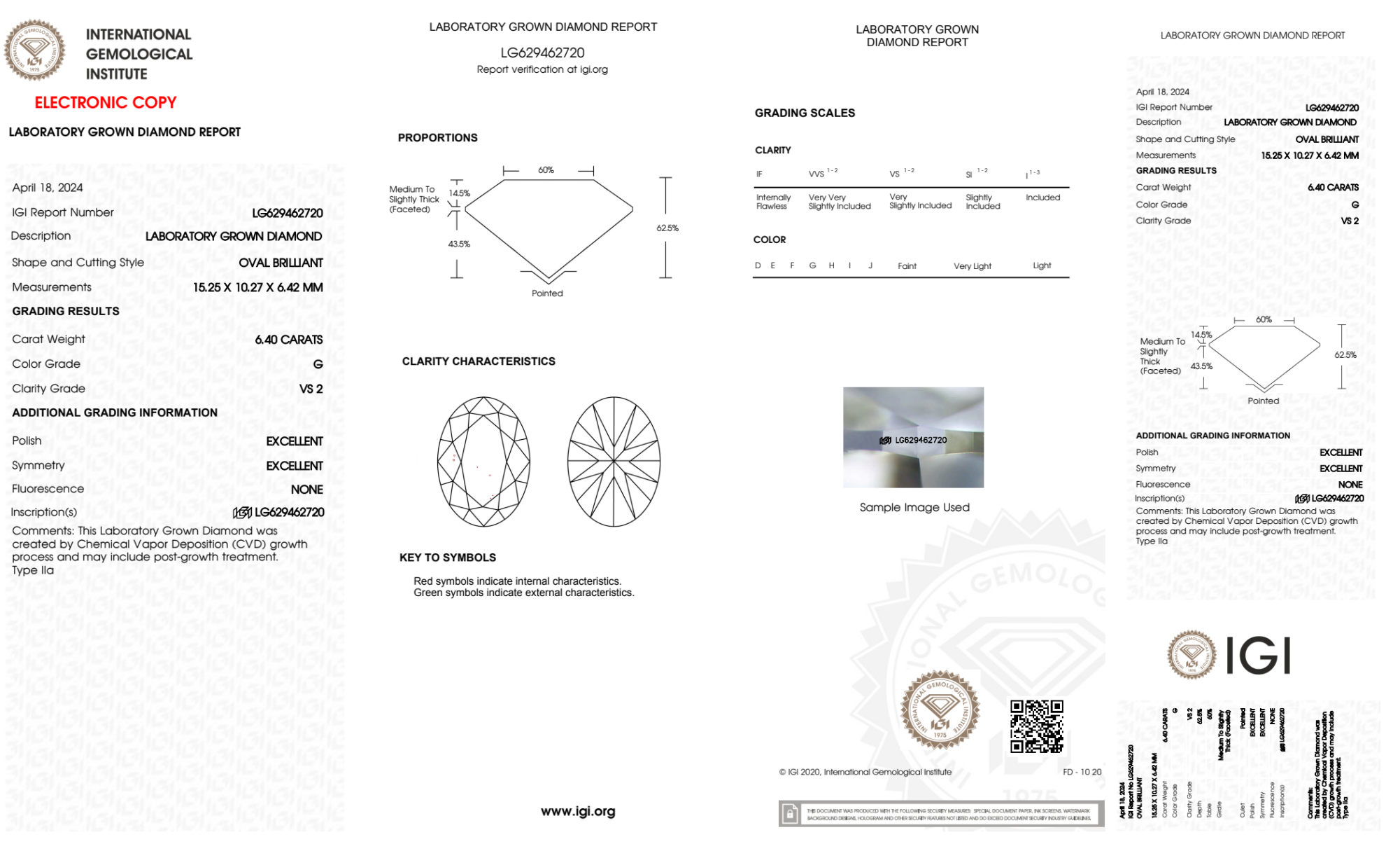 Your 6.40 carat Oval lab diamond is graded G color (Near Colorless), and you can read more about G color diamonds here.