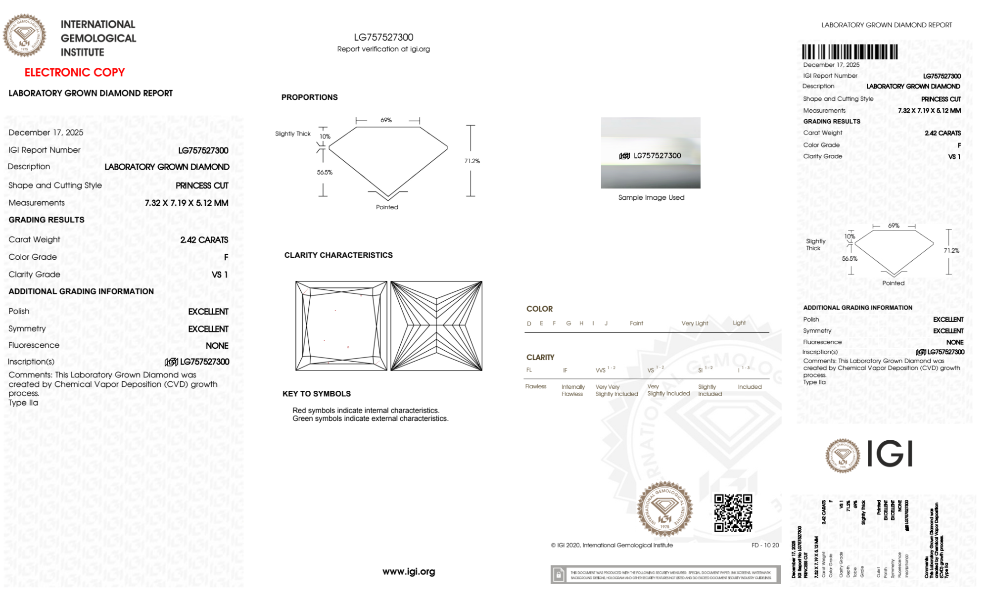 Your 2.42 carat Princess lab diamond is graded VS1 clarity, which stands for Very Slightly Included 1. Read more about VS1 clarity diamonds here, or learn more about diamond clarity in general here.