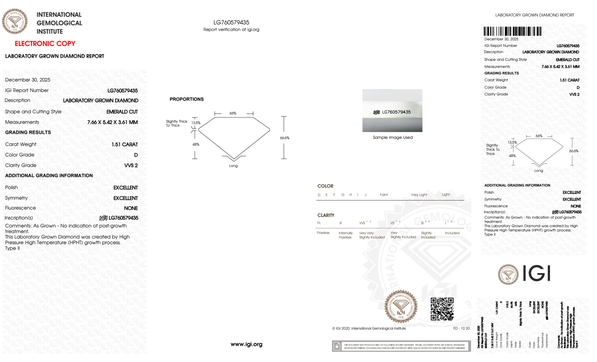 Your 1.51 carat Emerald lab diamond is graded D color (Colorless), and you can read more about D color diamonds here.