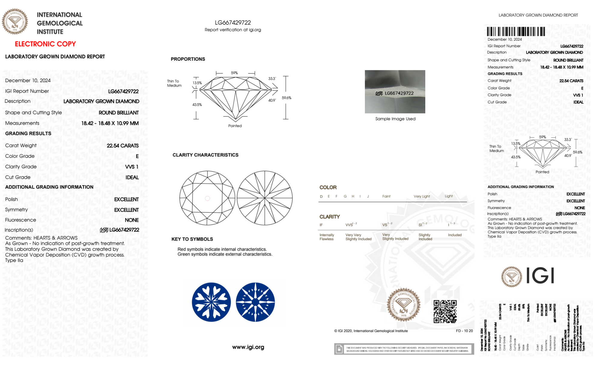Your 22.54 carat Round lab diamond is graded E color (Colorless), and you can read more about E color diamonds here.