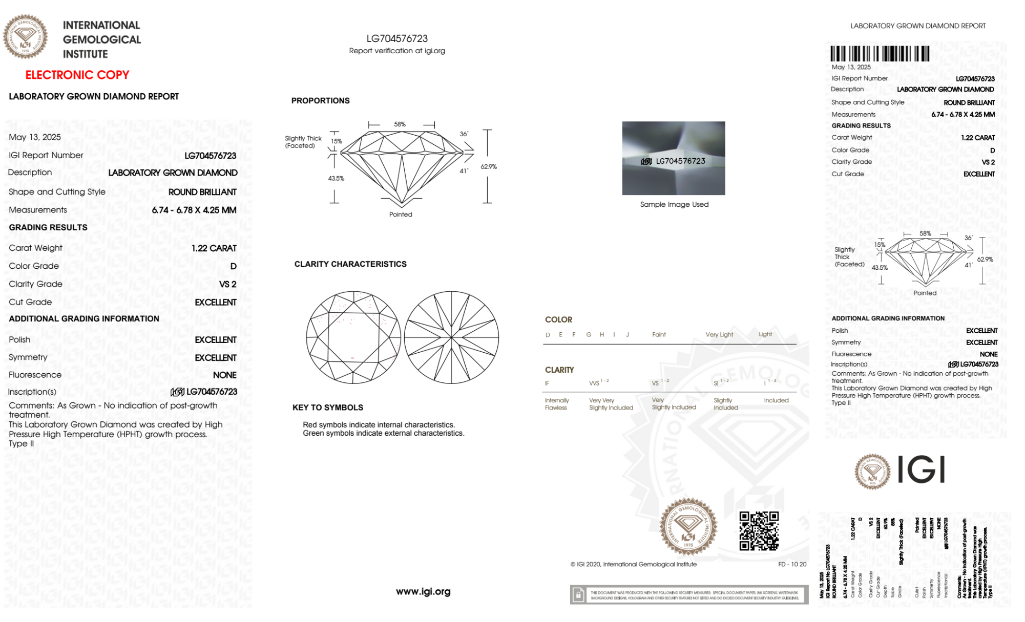 Your 1.22 carat Round lab diamond is graded D color (Colorless), and you can read more about D color diamonds here.