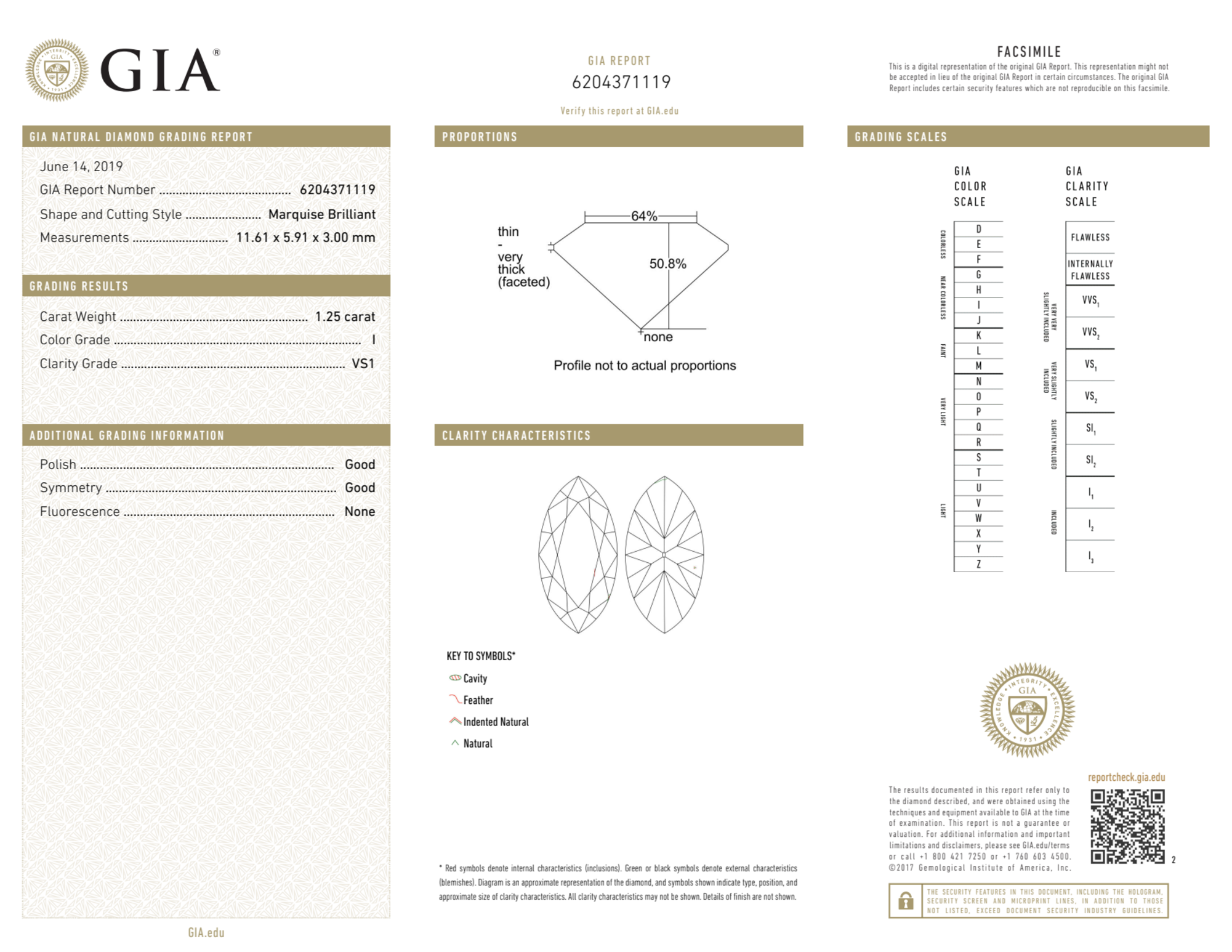 Your 1.25 carat Marquise natural diamond is graded VS1 clarity, which stands for Very Slightly Included 1. Read more about VS1 clarity diamonds here, or learn more about diamond clarity in general here.