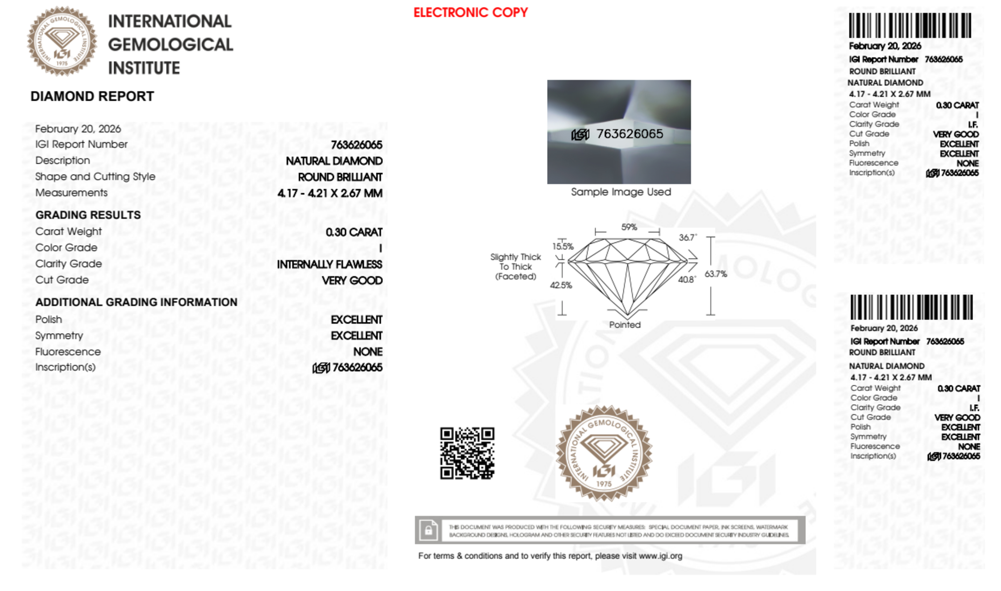 Your 0.30 carat Round natural diamond is graded IF clarity, which stands for Internally Flawless. Read more about IF clarity diamonds here, or learn more about diamond clarity in general here.