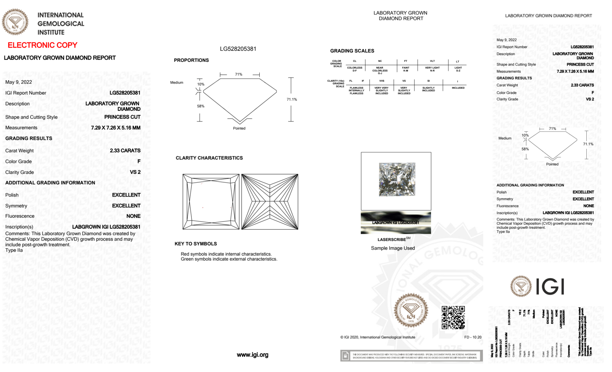 Your 2.33 carat Princess lab diamond is graded F color (Colorless), and you can read more about F color diamonds here.
