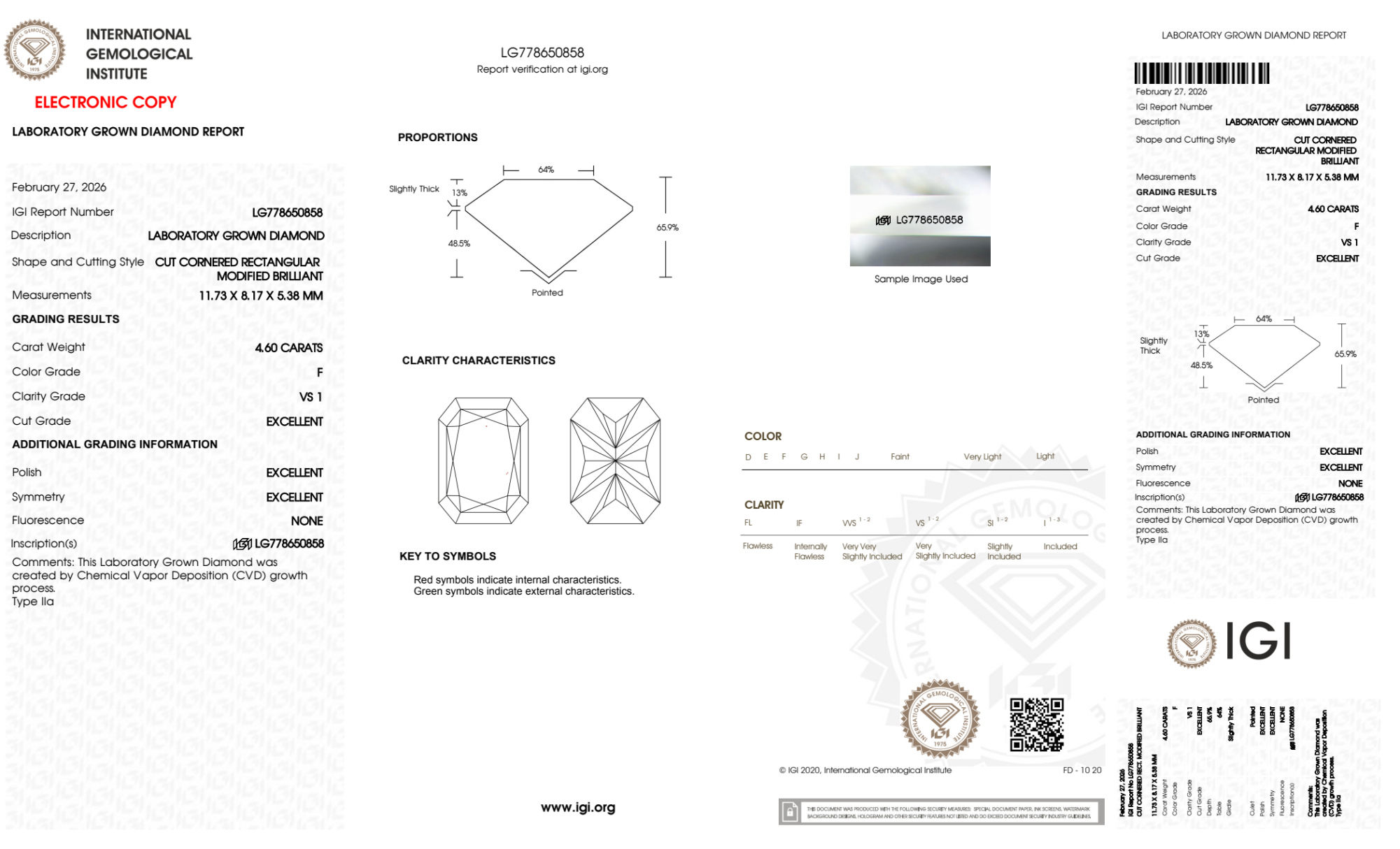 Your 4.60 carat Radiant lab diamond is graded F color (Colorless), and you can read more about F color diamonds here.