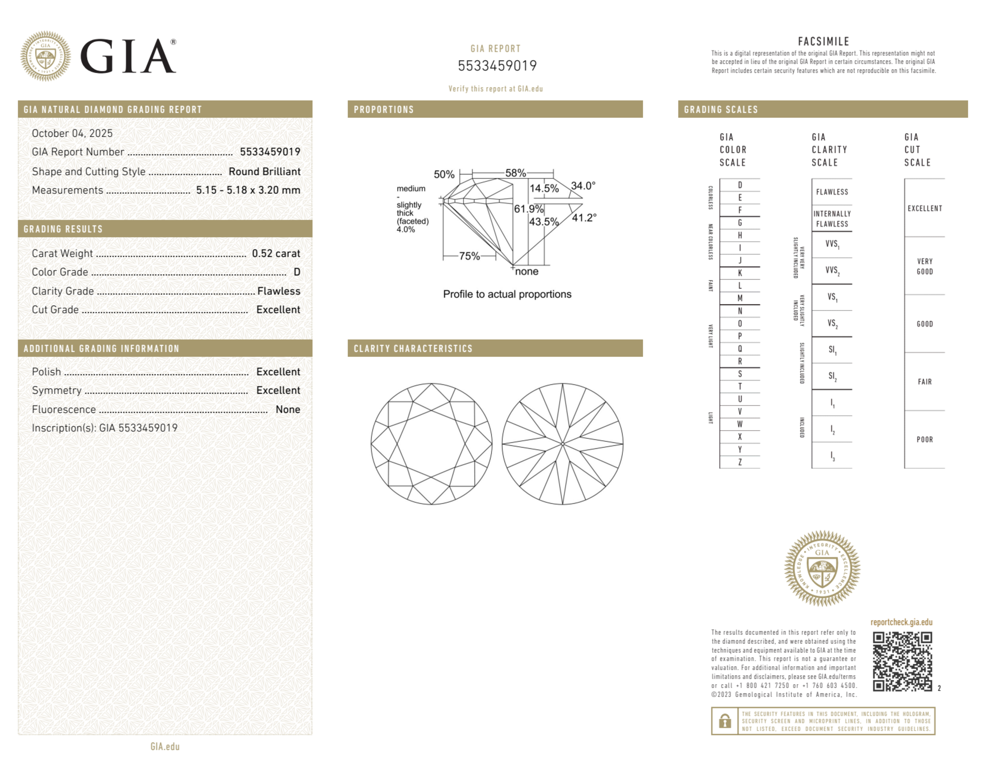 Your 0.52 carat Round natural diamond is graded FL clarity, which stands for Flawless. Read more about FL clarity diamonds here, or learn more about diamond clarity in general here.