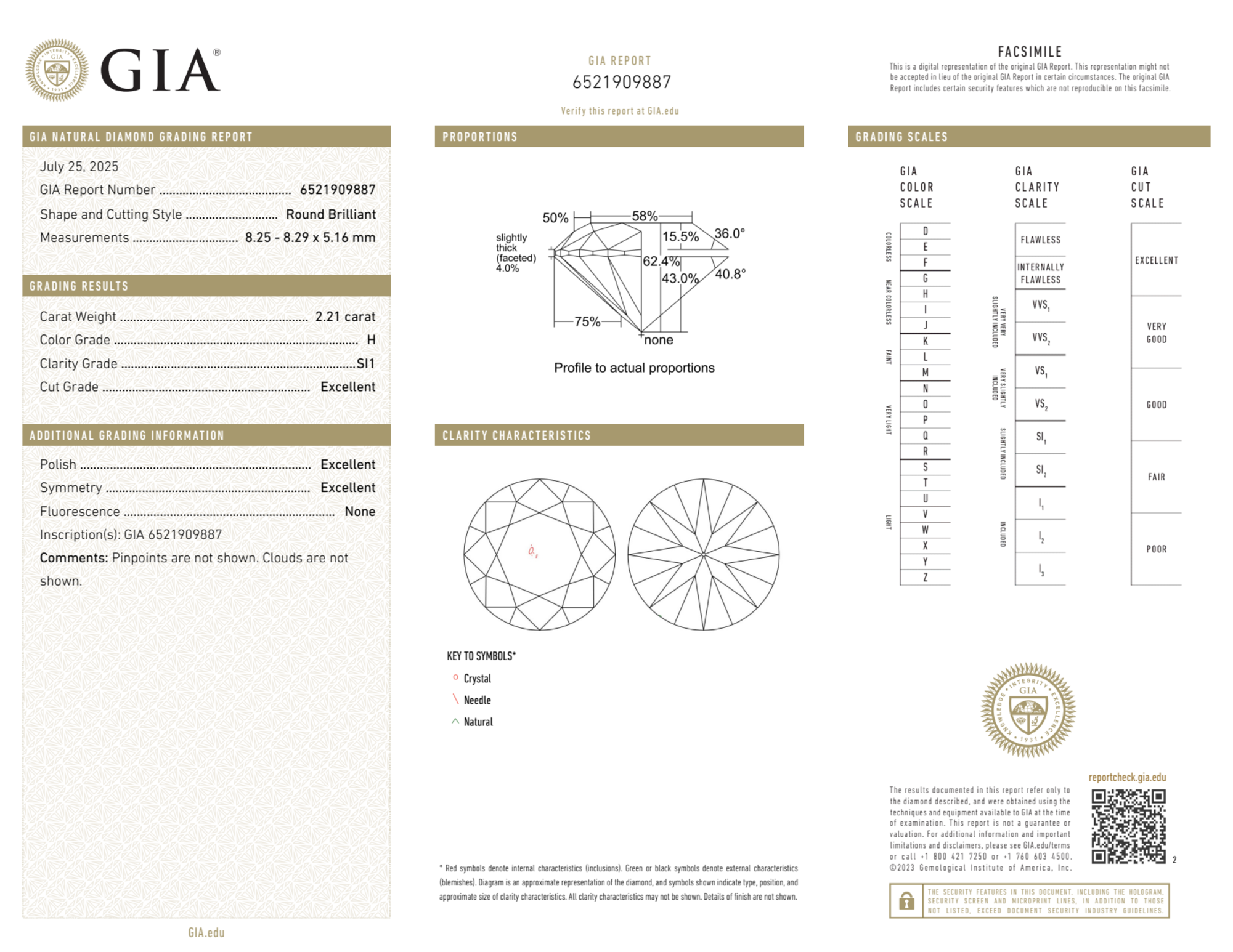 Your 2.21 carat Round natural diamond is graded H color (Near Colorless), and you can read more about H color diamonds here.