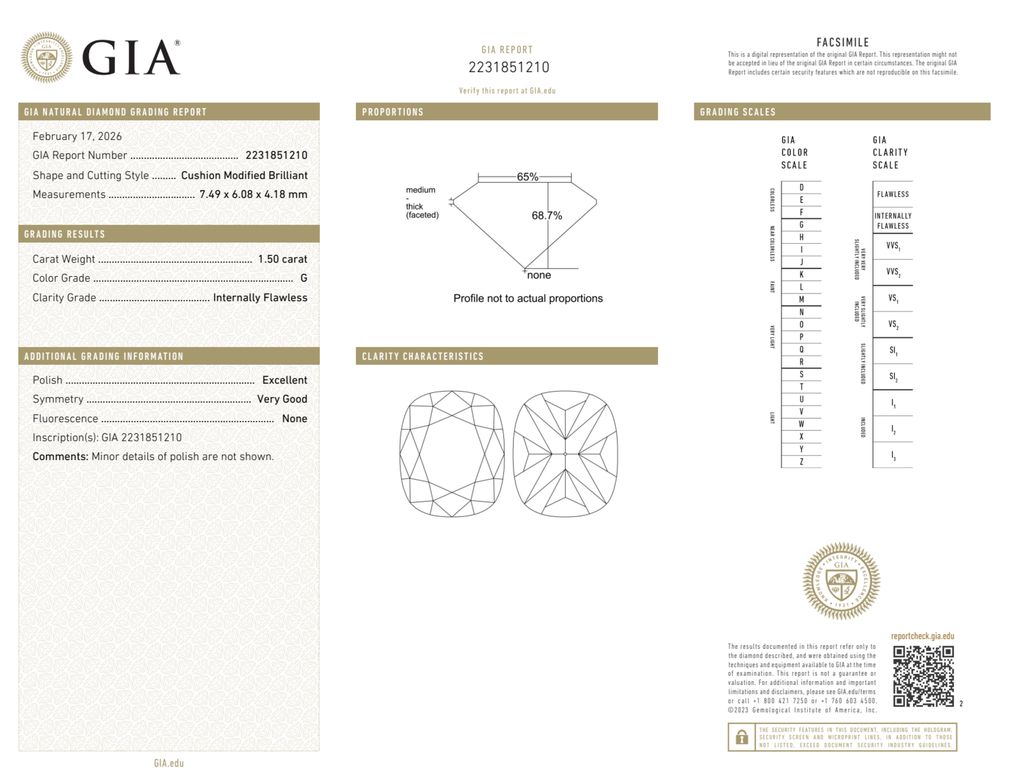 Your 1.50 carat Cushion natural diamond is graded IF clarity, which stands for Internally Flawless. Read more about IF clarity diamonds here, or learn more about diamond clarity in general here.