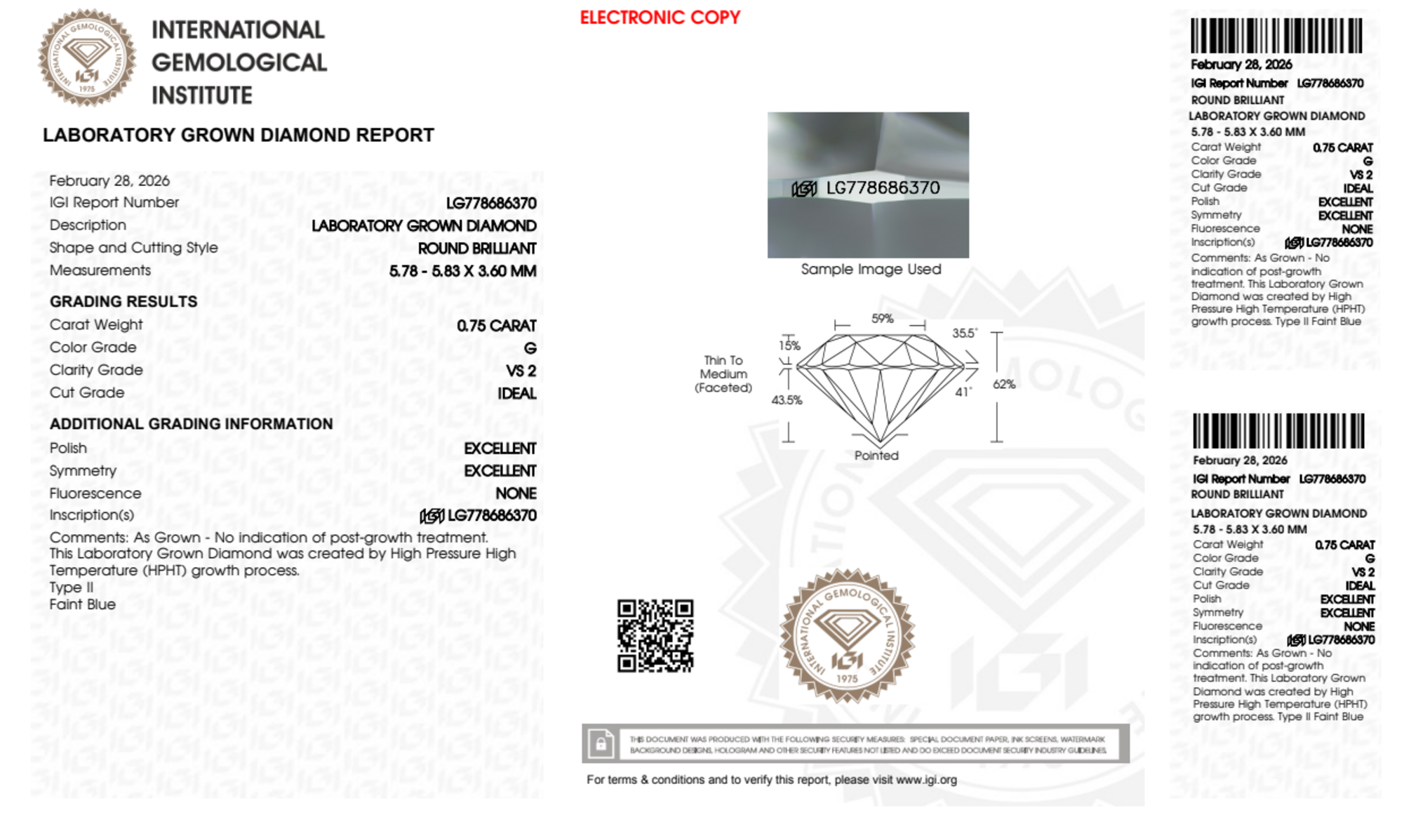 Your 0.75 carat Round lab diamond is graded G color (Near Colorless), and you can read more about G color diamonds here.