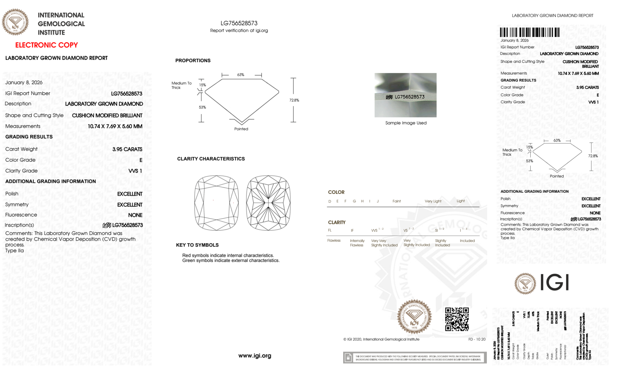 Your 3.95 carat Cushion lab diamond is graded E color (Colorless), and you can read more about E color diamonds here.
