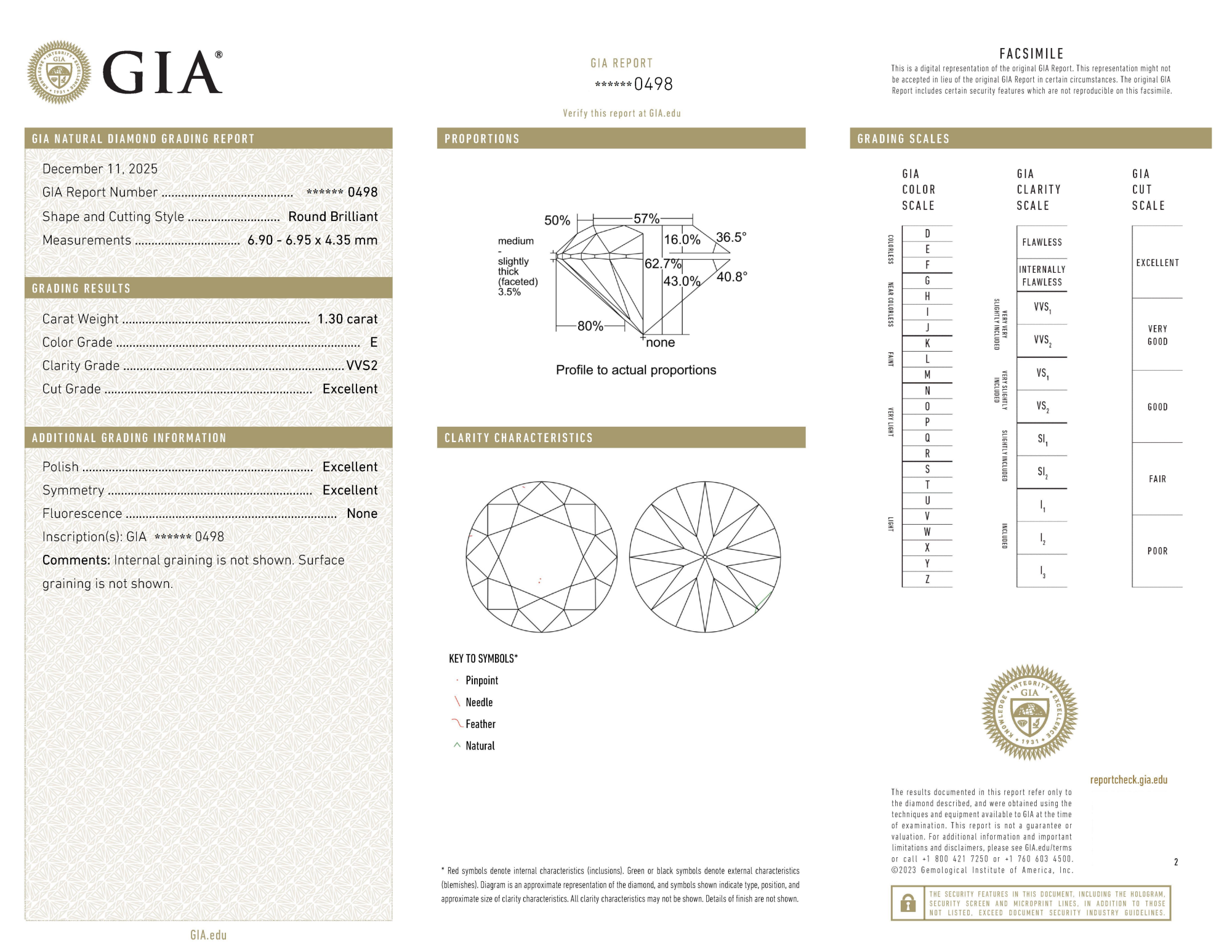 Your 1.30 carat Round natural diamond is graded E color (Colorless), and you can read more about E color diamonds here.