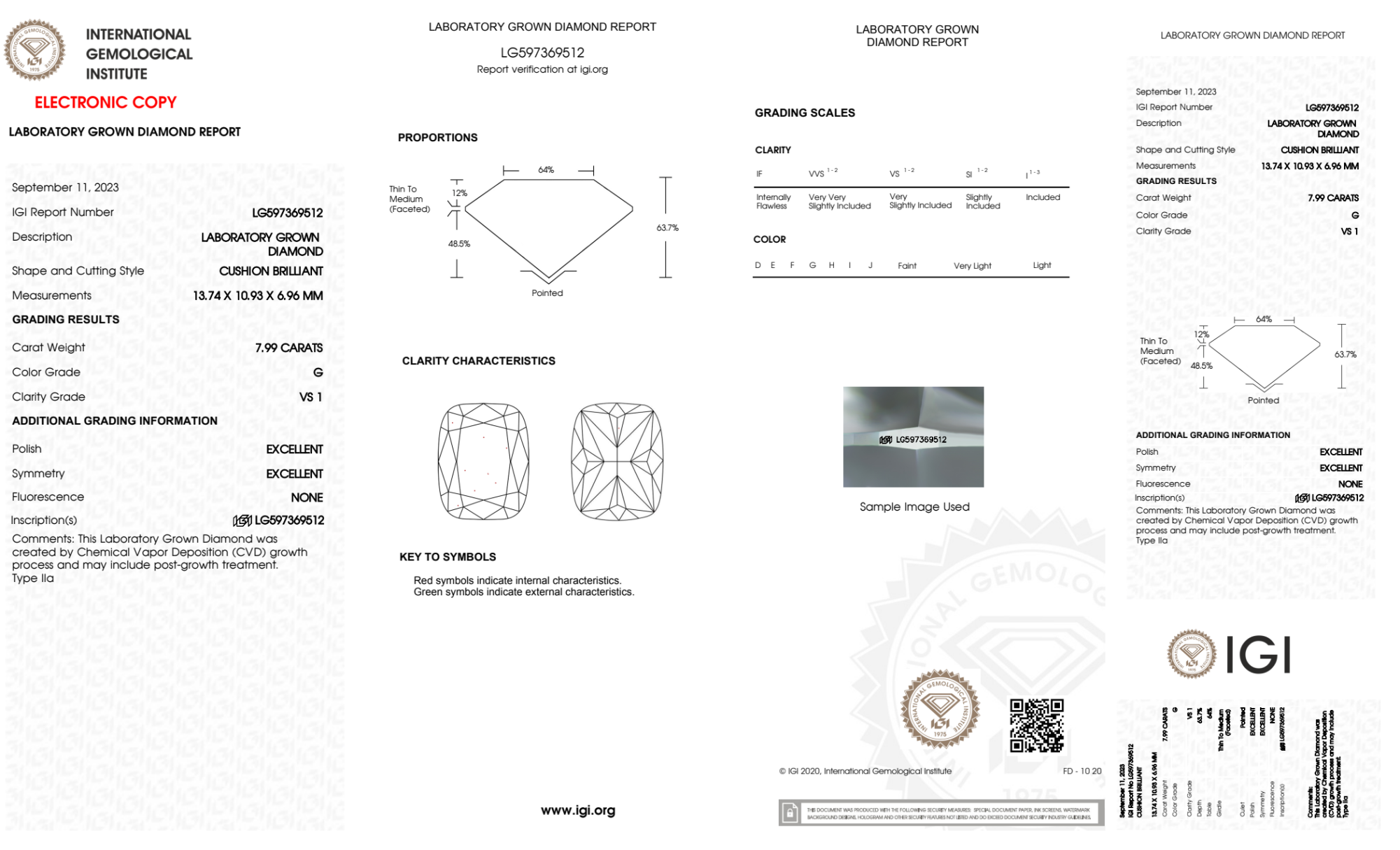 Your 7.99 carat Cushion lab diamond is graded G color (Near Colorless), and you can read more about G color diamonds here.