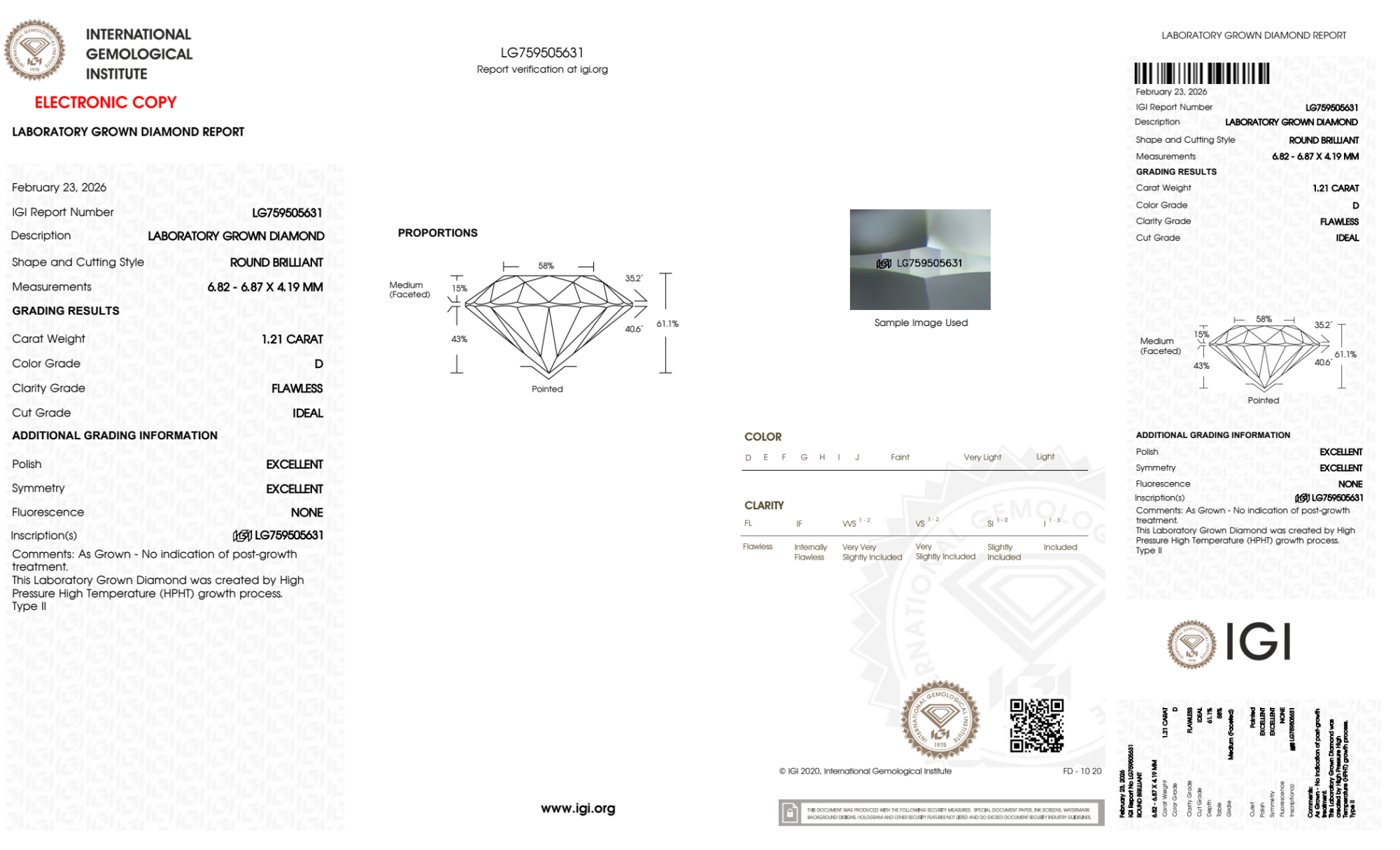 Your 1.21 carat Round lab diamond is graded FL clarity, which stands for Flawless. Read more about FL clarity diamonds here, or learn more about diamond clarity in general here.
