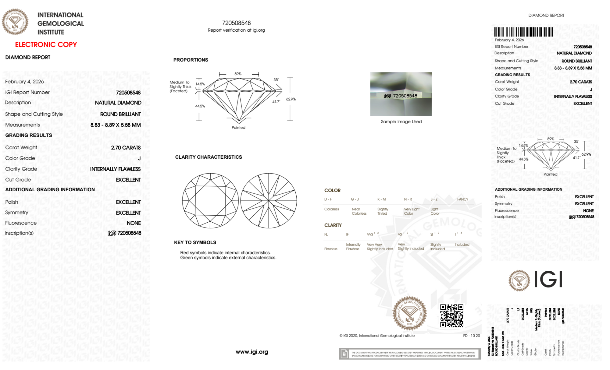 Your 2.70 carat Round natural diamond is graded IF clarity, which stands for Internally Flawless. Read more about IF clarity diamonds here, or learn more about diamond clarity in general here.