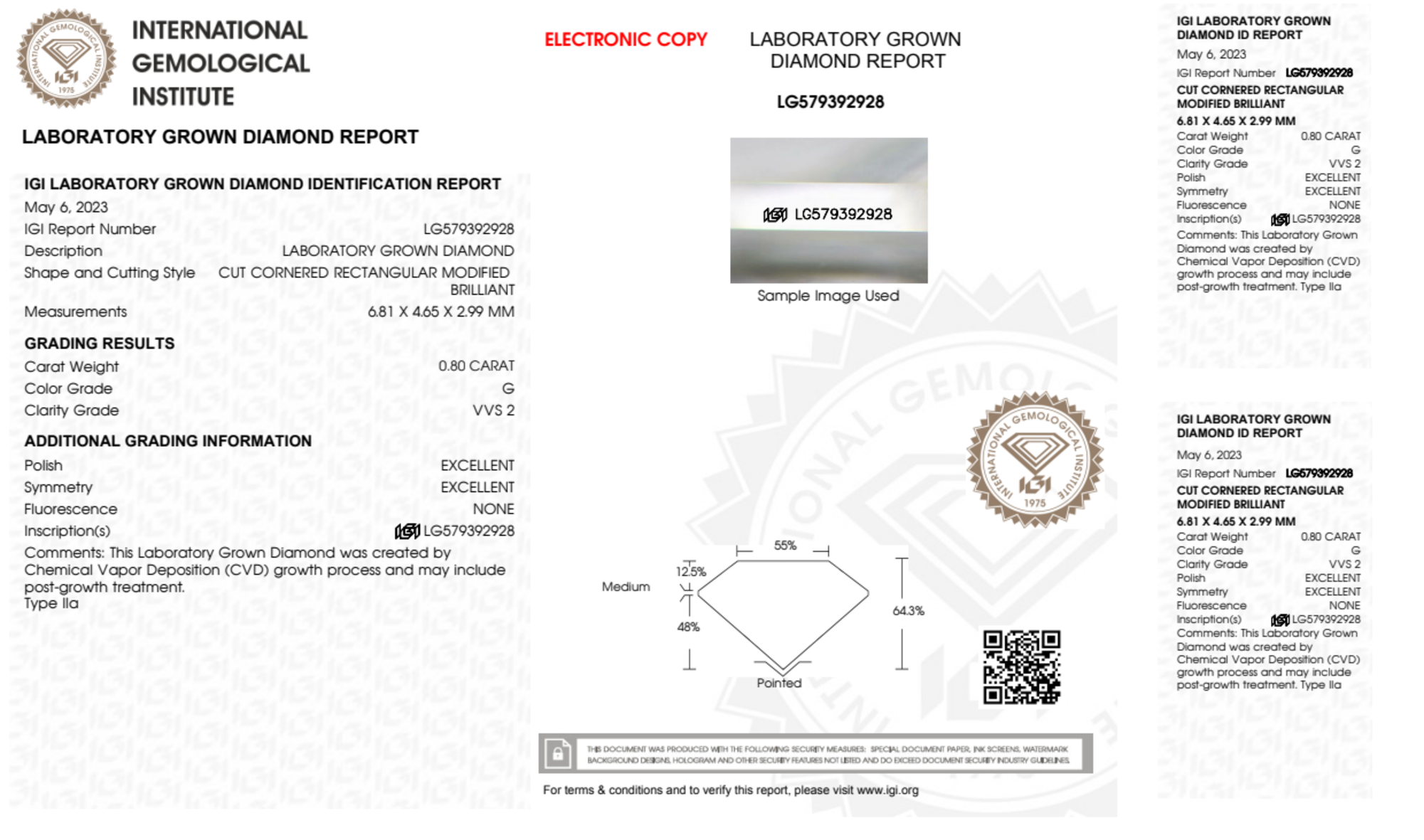 Your 0.80 carat Radiant lab diamond is graded G color (Near Colorless), and you can read more about G color diamonds here.