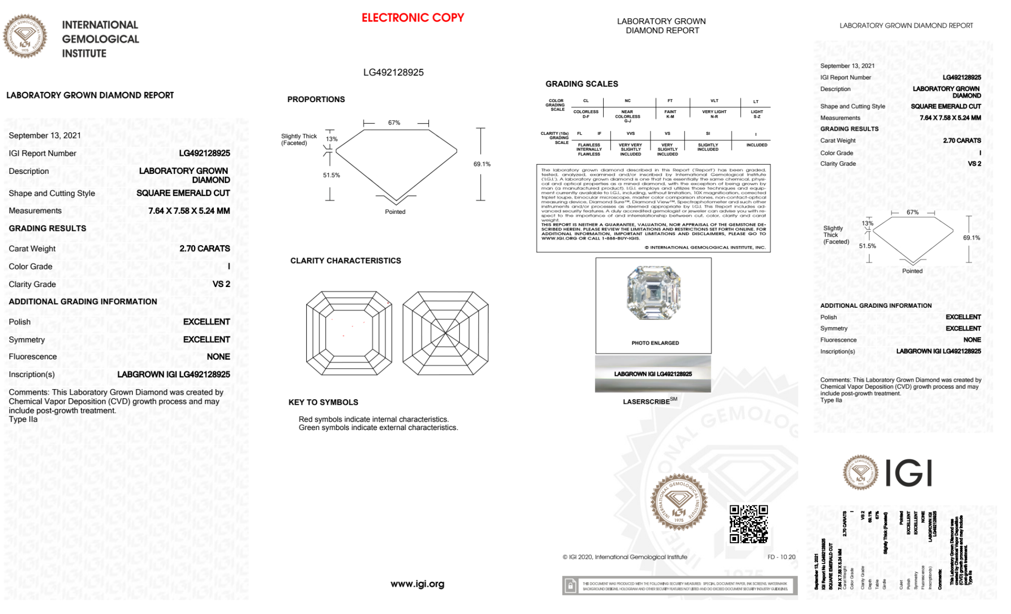 Your 2.70 carat Asscher lab diamond is graded I color (Near Colorless), and you can read more about I color diamonds here.