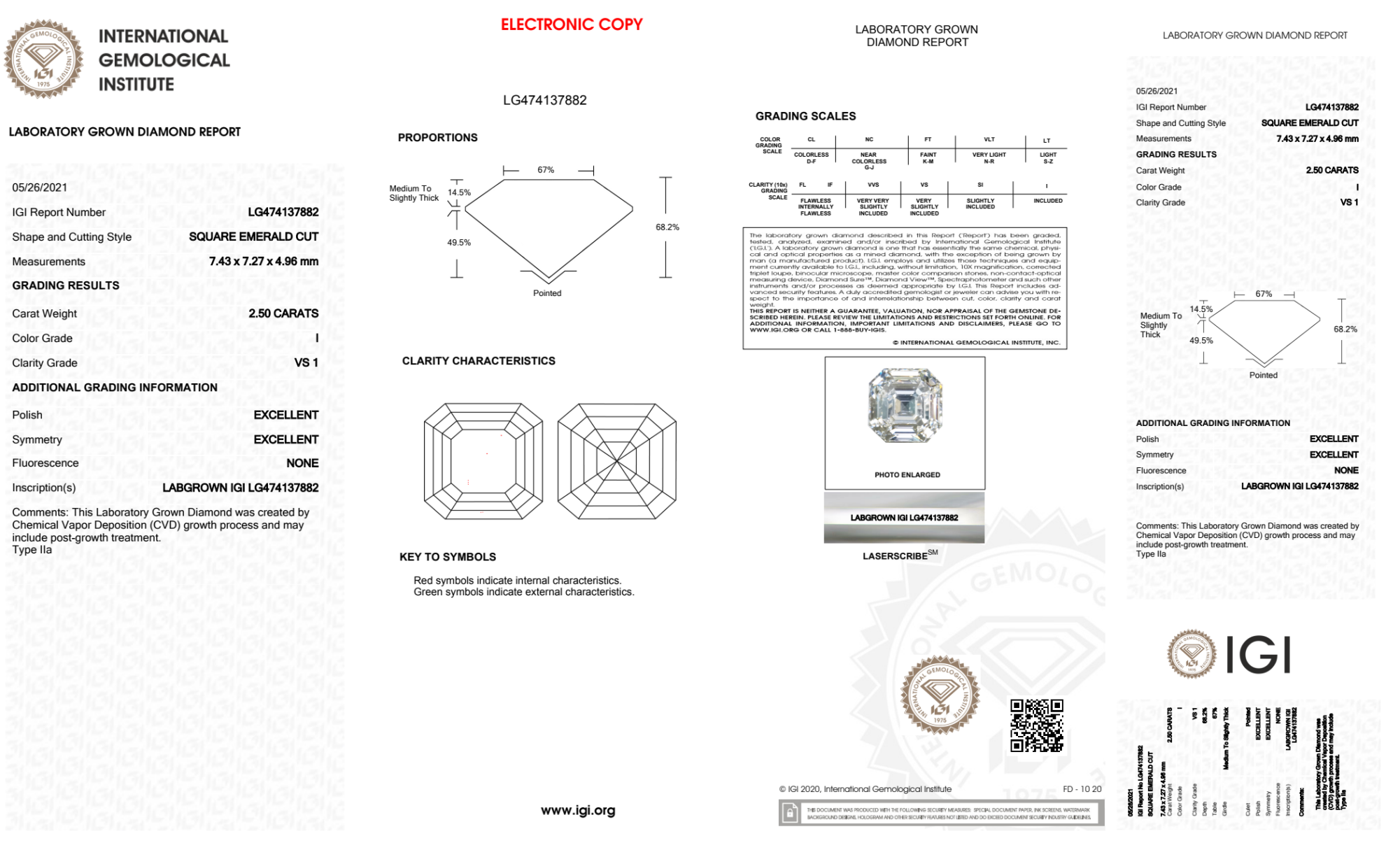 Your 2.50 carat Asscher lab diamond is graded I color (Near Colorless), and you can read more about I color diamonds here.