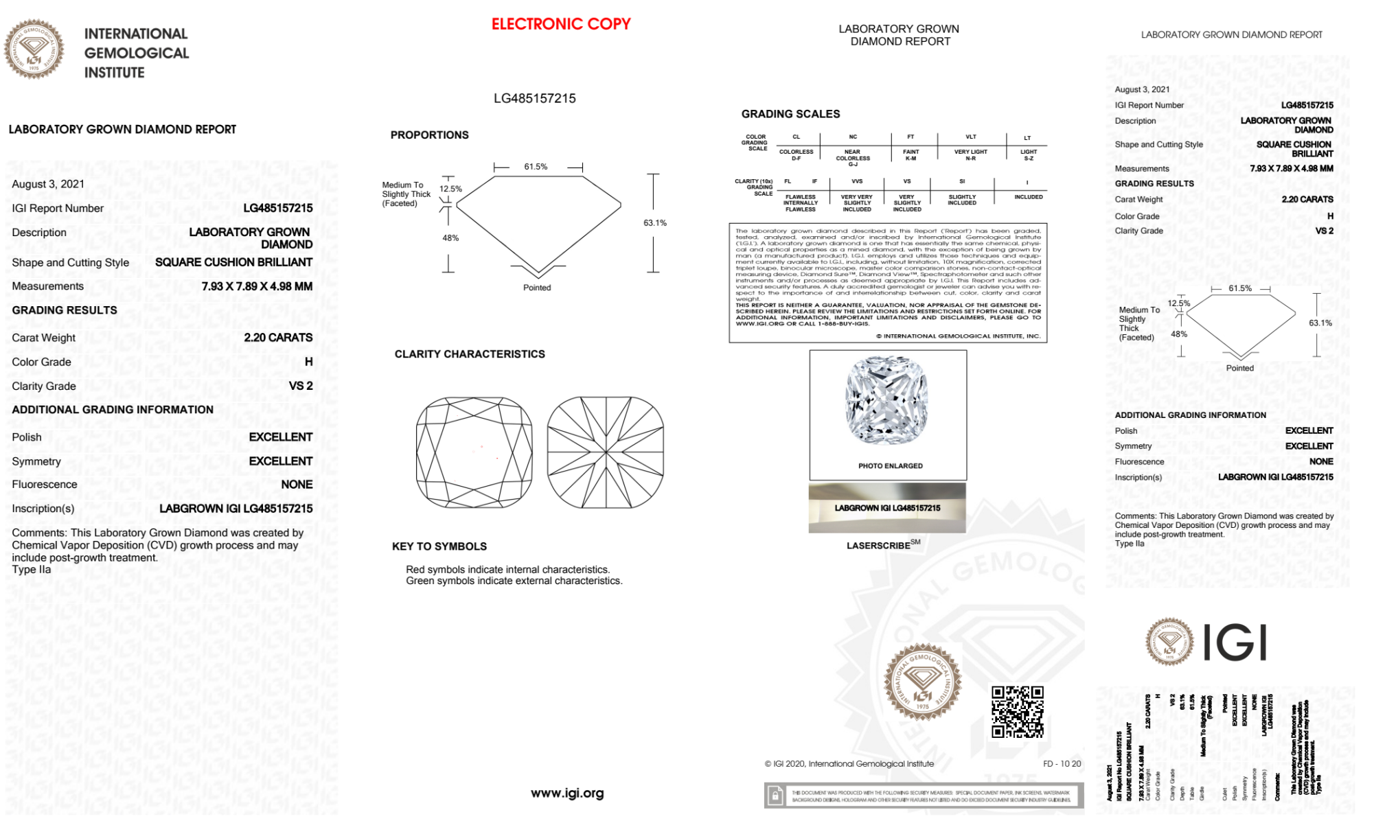 Your 2.20 carat Cushion lab diamond is graded VS2 clarity, which stands for Very Slightly Included 2. Read more about VS2 clarity diamonds here, or learn more about diamond clarity in general here.
