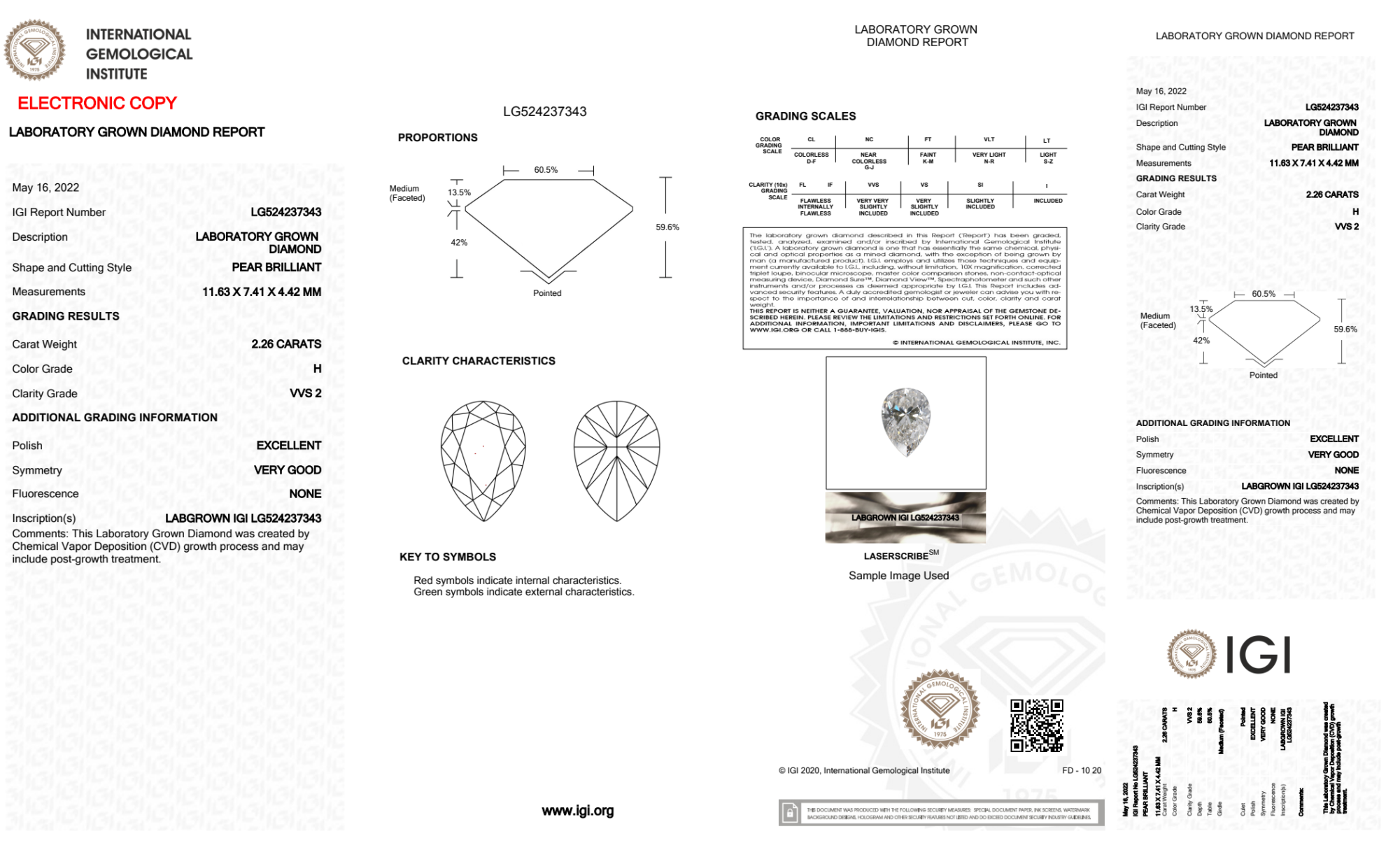 Your 2.26 carat Pear lab diamond is graded H color (Near Colorless), and you can read more about H color diamonds here.