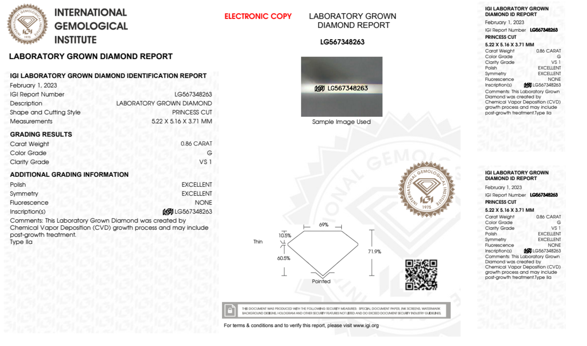Your 0.86 carat Princess lab diamond is graded G color (Near Colorless), and you can read more about G color diamonds here.
