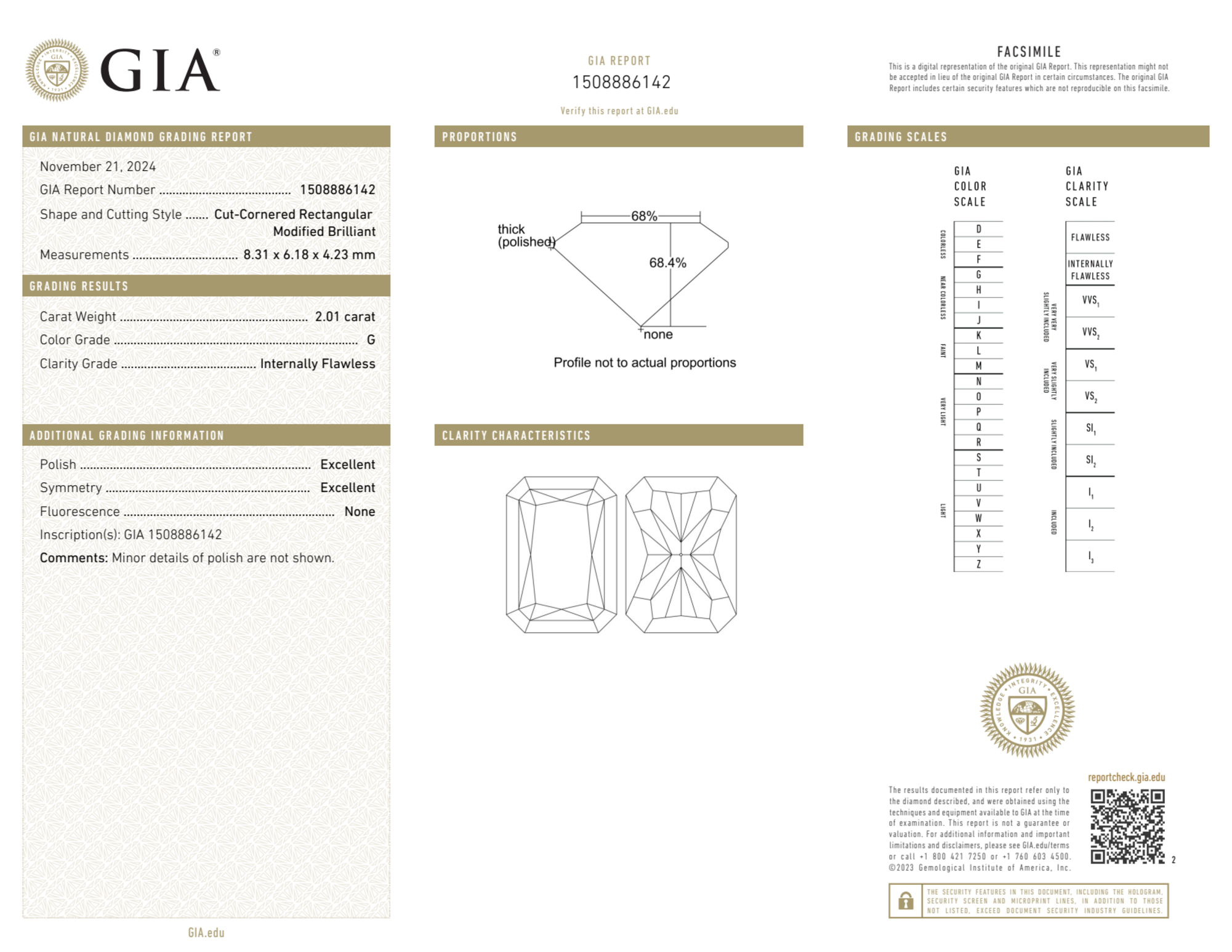 Your 2.01 carat Radiant natural diamond is graded IF clarity, which stands for Internally Flawless. Read more about IF clarity diamonds here, or learn more about diamond clarity in general here.