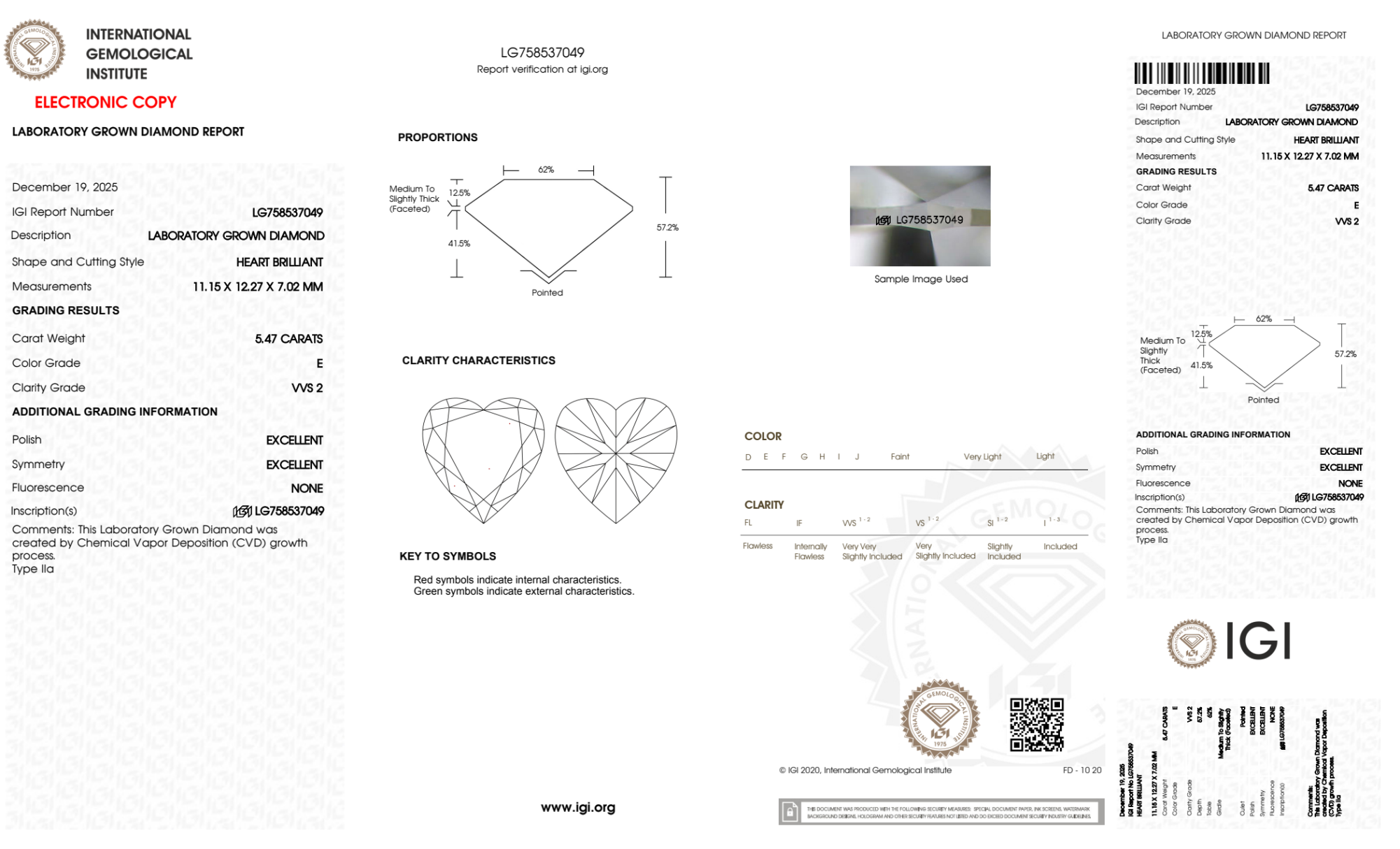 Your 5.47 carat Heart lab diamond is graded E color (Colorless), and you can read more about E color diamonds here.