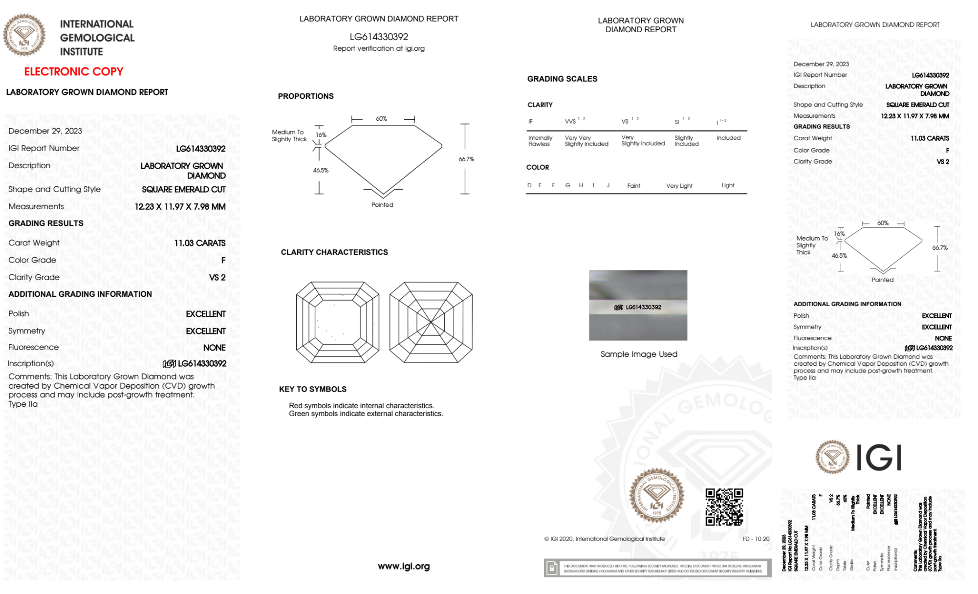Your 11.03 carat Asscher lab diamond is graded F color (Colorless), and you can read more about F color diamonds here.