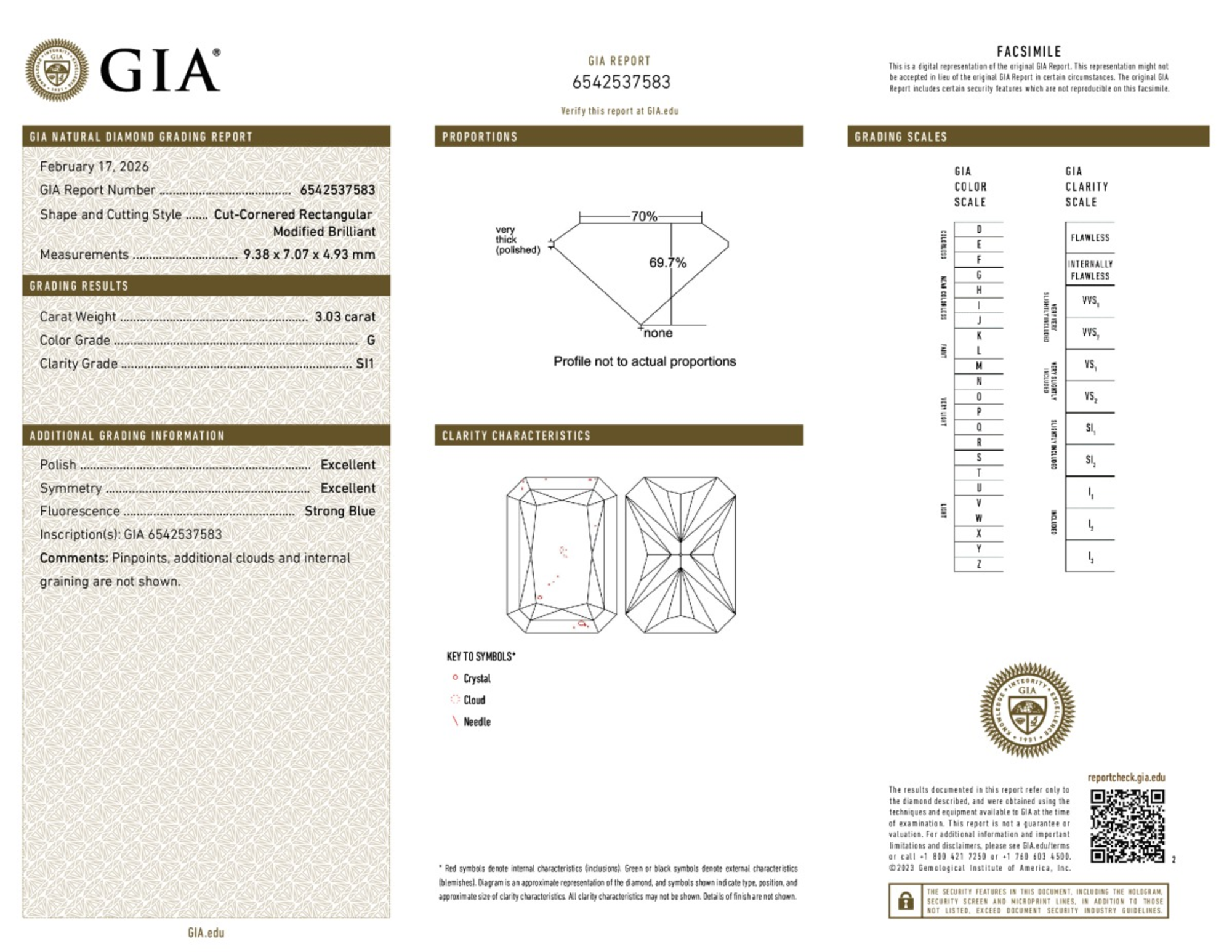 Your 3.03 carat Radiant natural diamond is graded G color (Near Colorless), and you can read more about G color diamonds here.