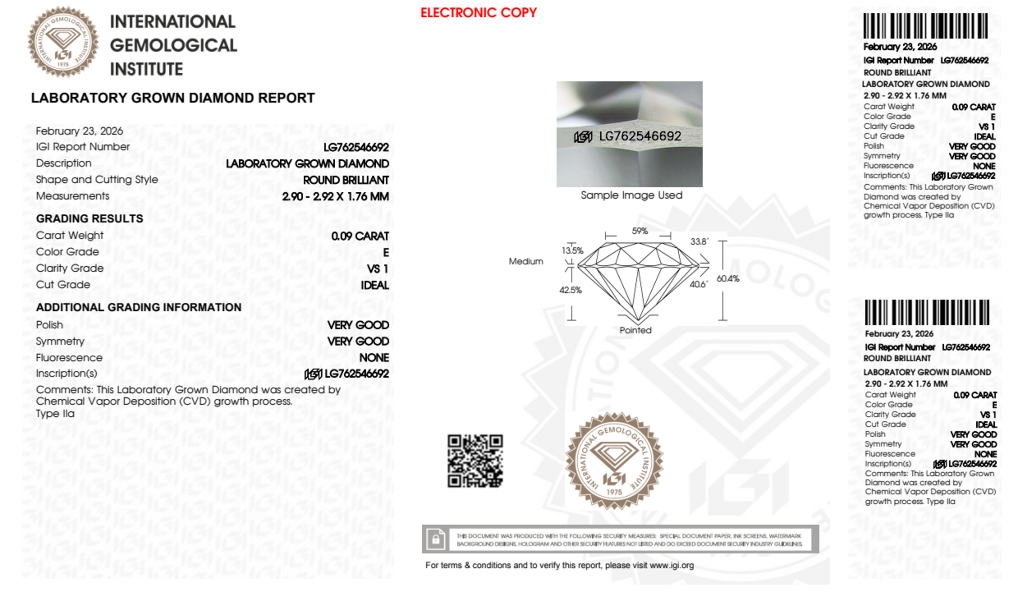 Your 0.09 carat Round lab diamond is graded E color (Colorless), and you can read more about E color diamonds here.