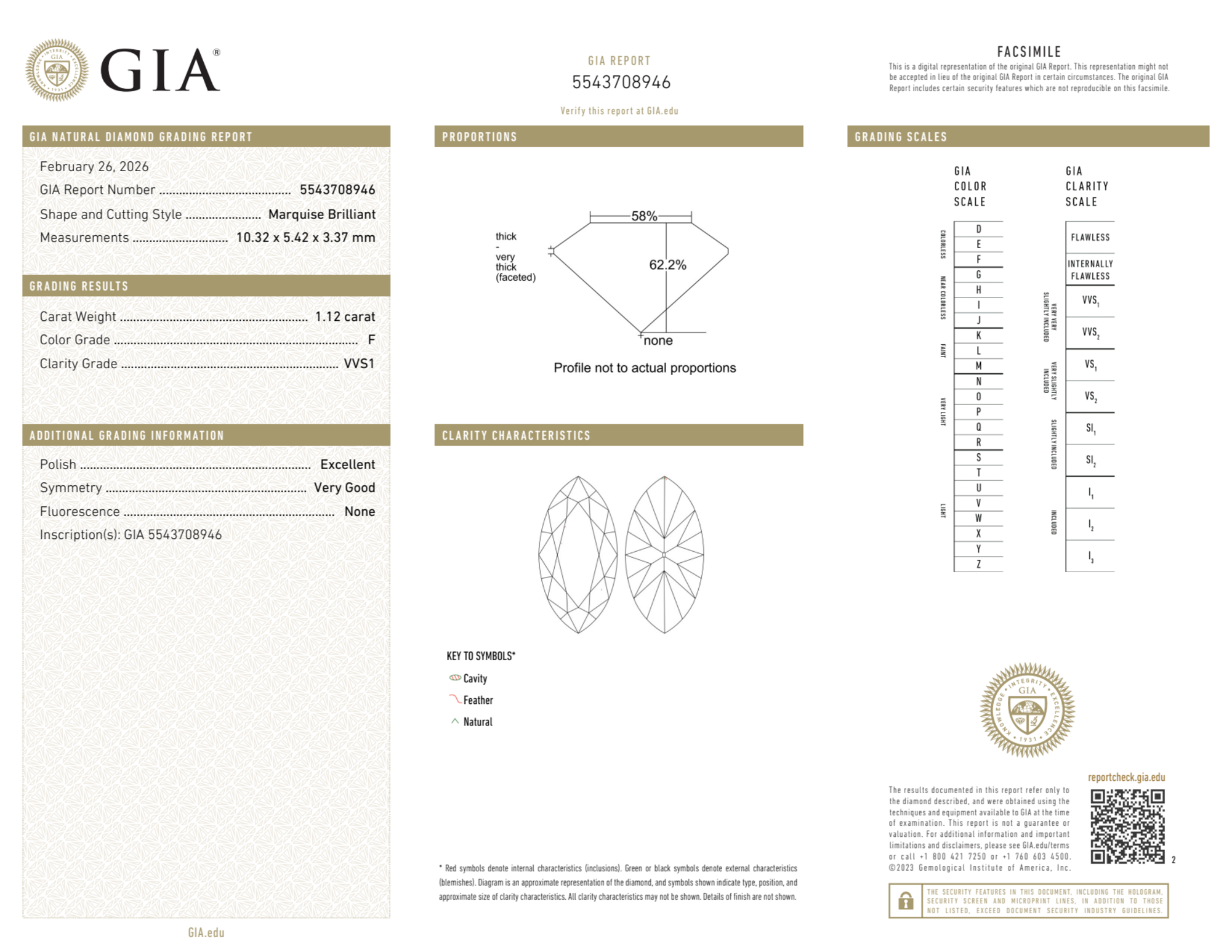 Your 1.12 carat Marquise natural diamond is graded F color (Colorless), and you can read more about F color diamonds here.