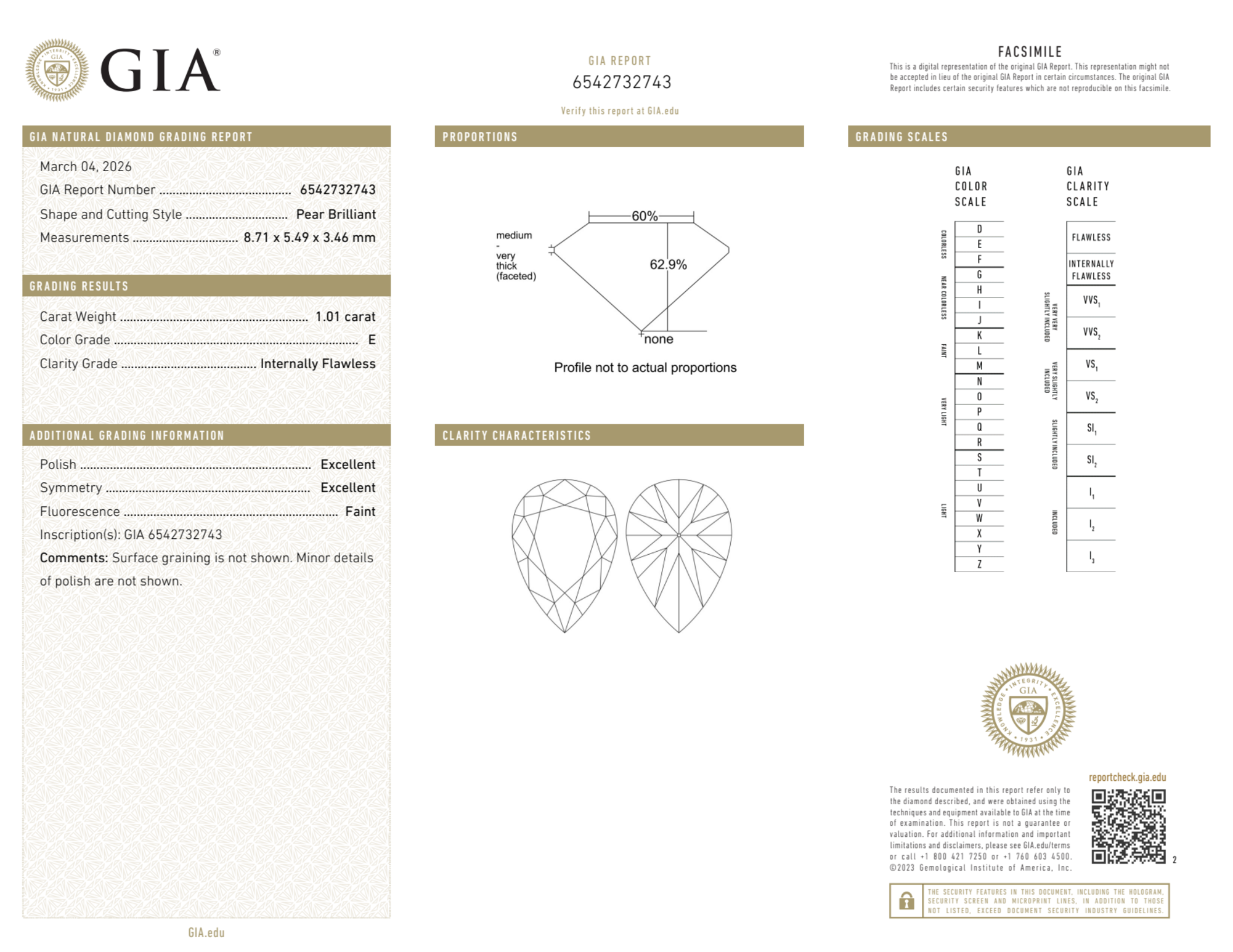Your 1.01 carat Pear natural diamond is graded E color (Colorless), and you can read more about E color diamonds here.