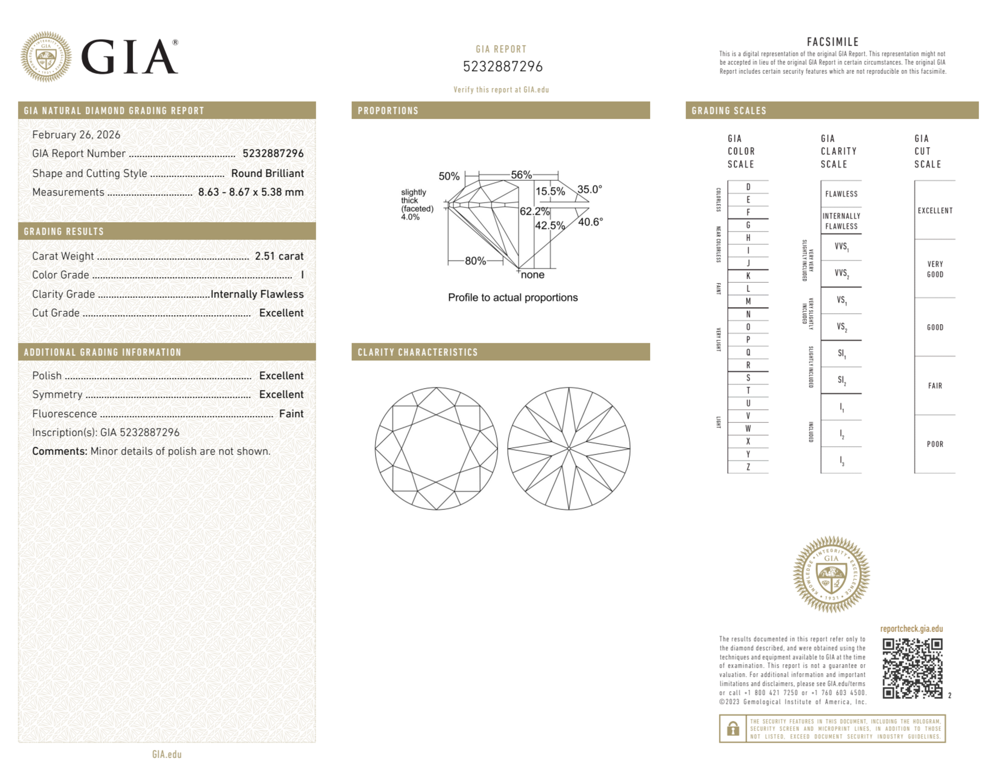Your 2.51 carat Round natural diamond is graded IF clarity, which stands for Internally Flawless. Read more about IF clarity diamonds here, or learn more about diamond clarity in general here.