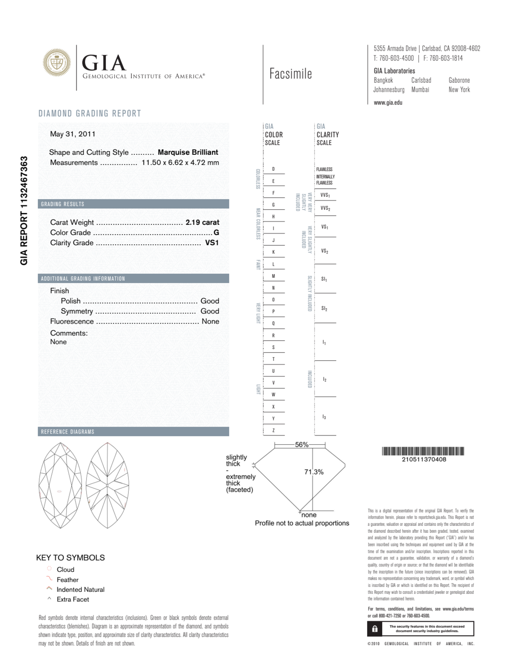 Your 2.19 carat Marquise natural diamond is graded VS1 clarity, which stands for Very Slightly Included 1. Read more about VS1 clarity diamonds here, or learn more about diamond clarity in general here.