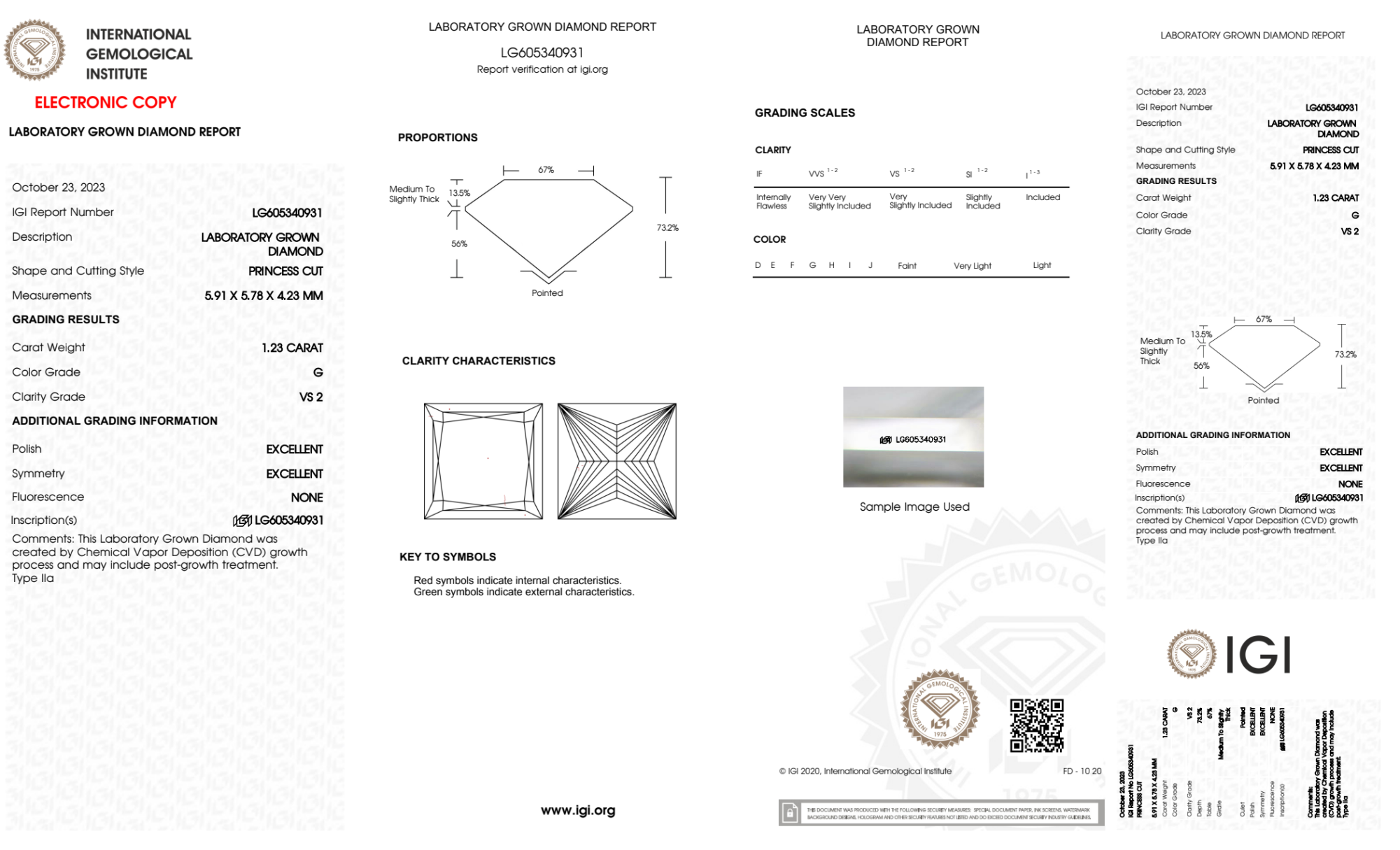 Your 1.23 carat Princess lab diamond is graded G color (Near Colorless), and you can read more about G color diamonds here.