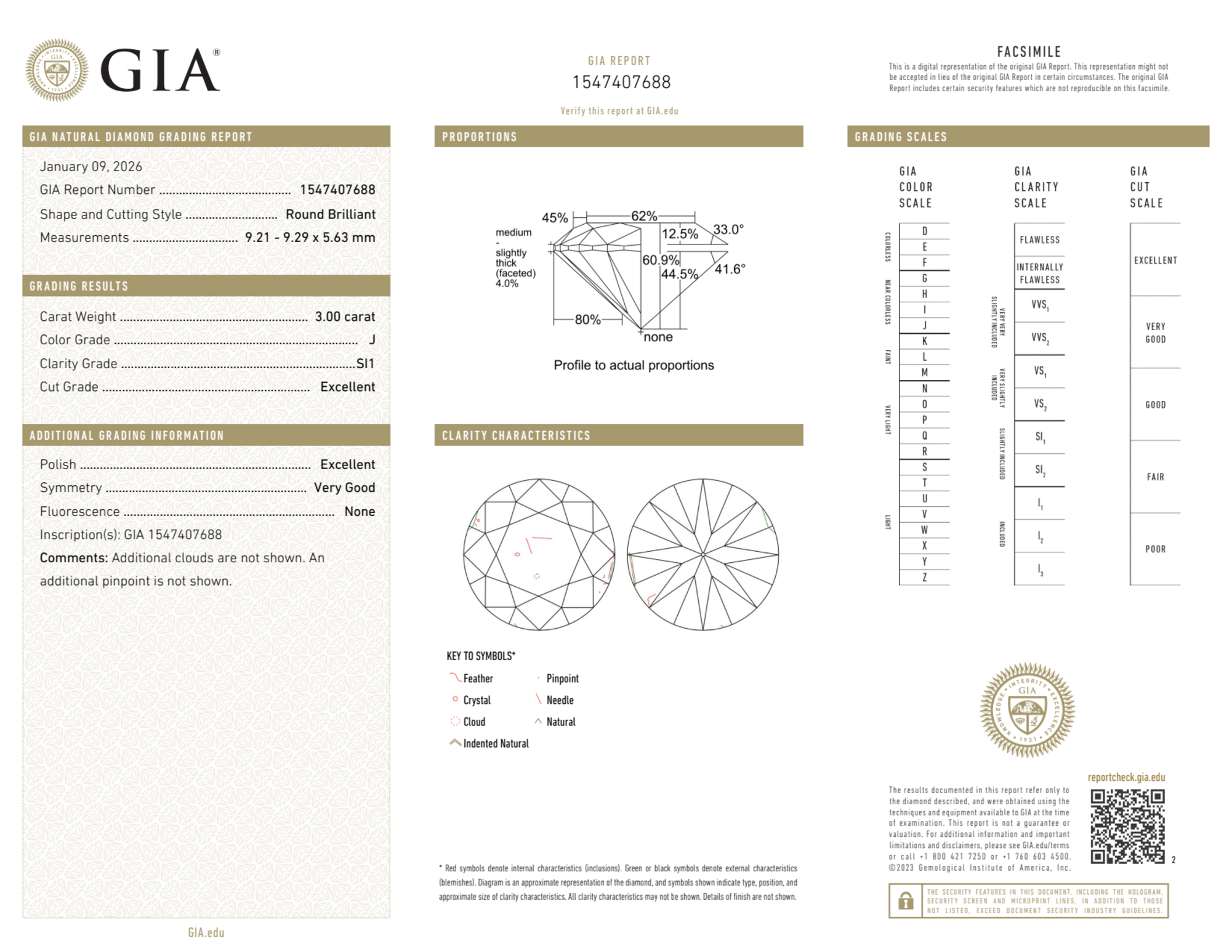 Your 3.00 carat Round natural diamond is graded J color (Near Colorless), and you can read more about J color diamonds here.