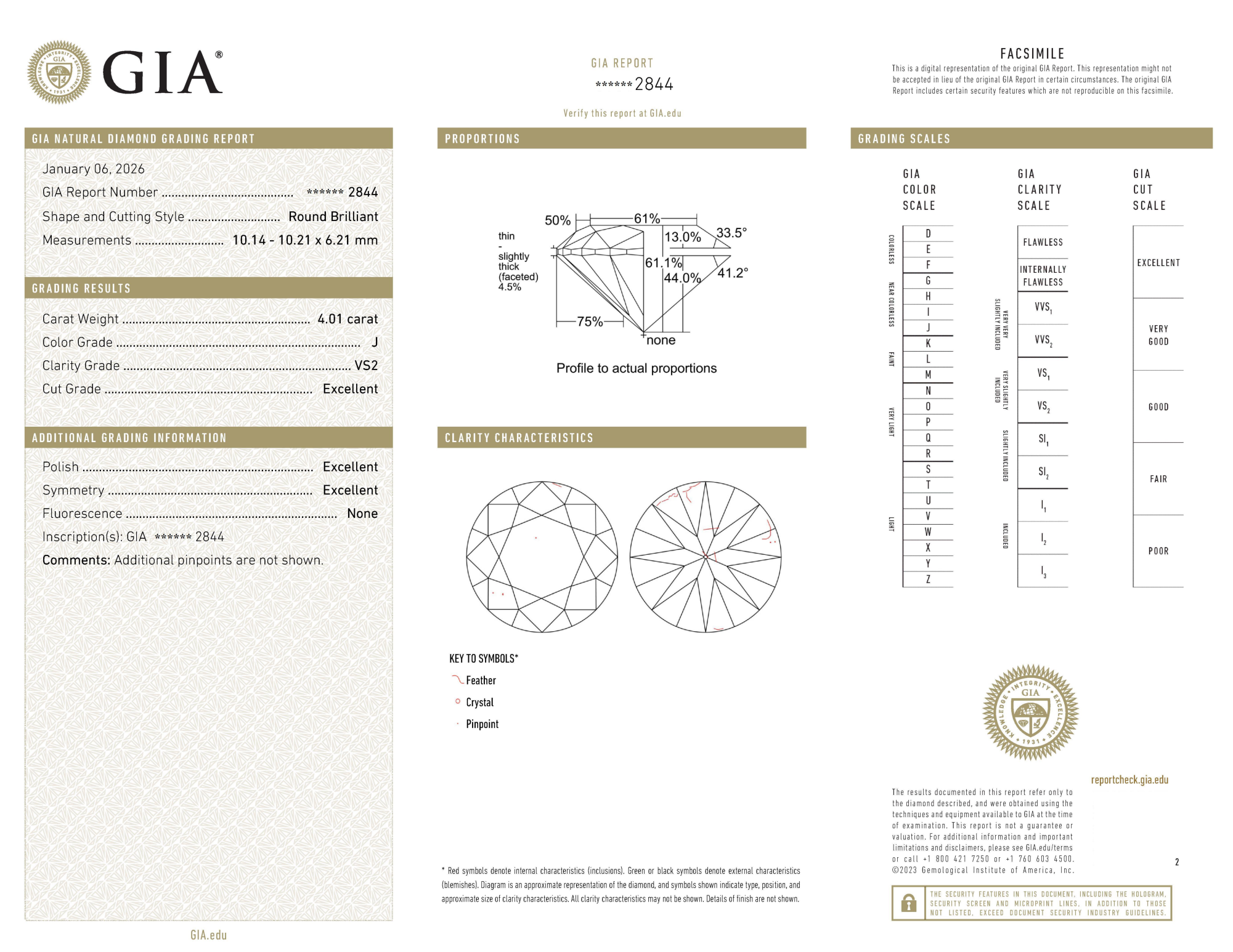 Your 4.01 carat Round natural diamond is graded J color (Near Colorless), and you can read more about J color diamonds here.