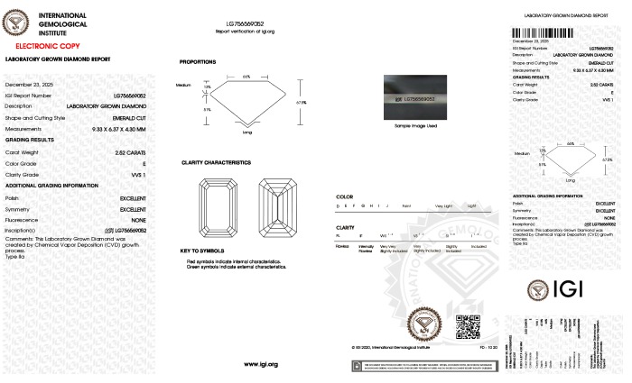 Your 2.52 carat Emerald lab diamond is graded E color (Colorless), and you can read more about E color diamonds here.