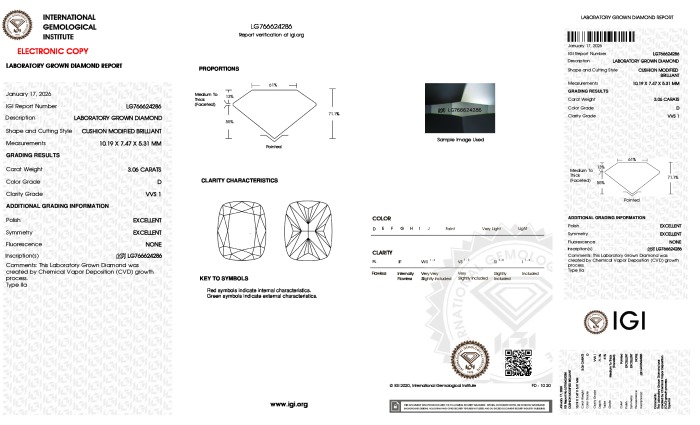 Your 3.06 carat Cushion lab diamond is graded D color (Colorless), and you can read more about D color diamonds here.