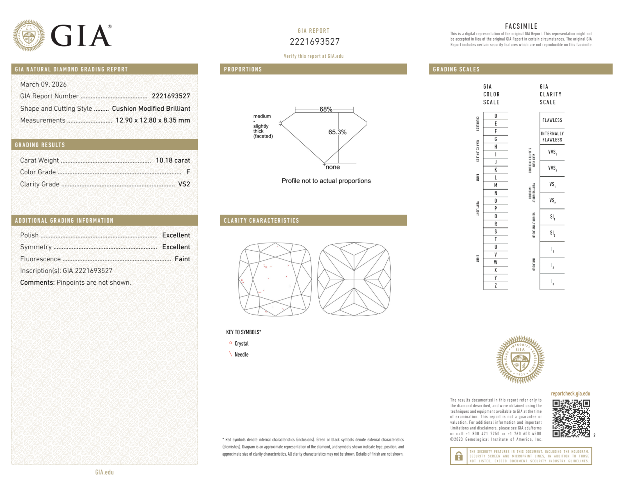 Your 10.18 carat Cushion natural diamond is graded F color (Colorless), and you can read more about F color diamonds here.