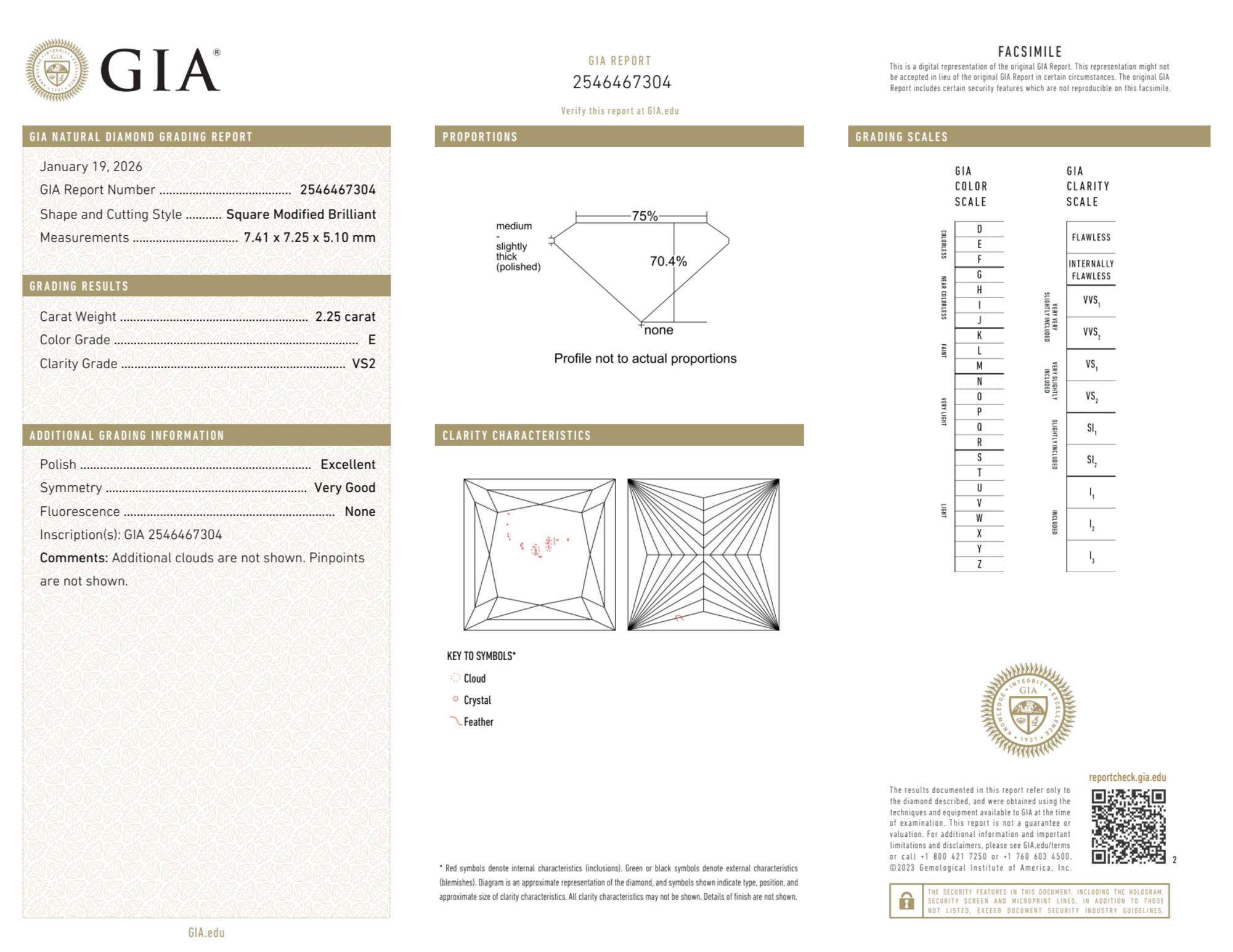 Your 2.25 carat Princess natural diamond is graded VS2 clarity, which stands for Very Slightly Included 2. Read more about VS2 clarity diamonds here, or learn more about diamond clarity in general here.