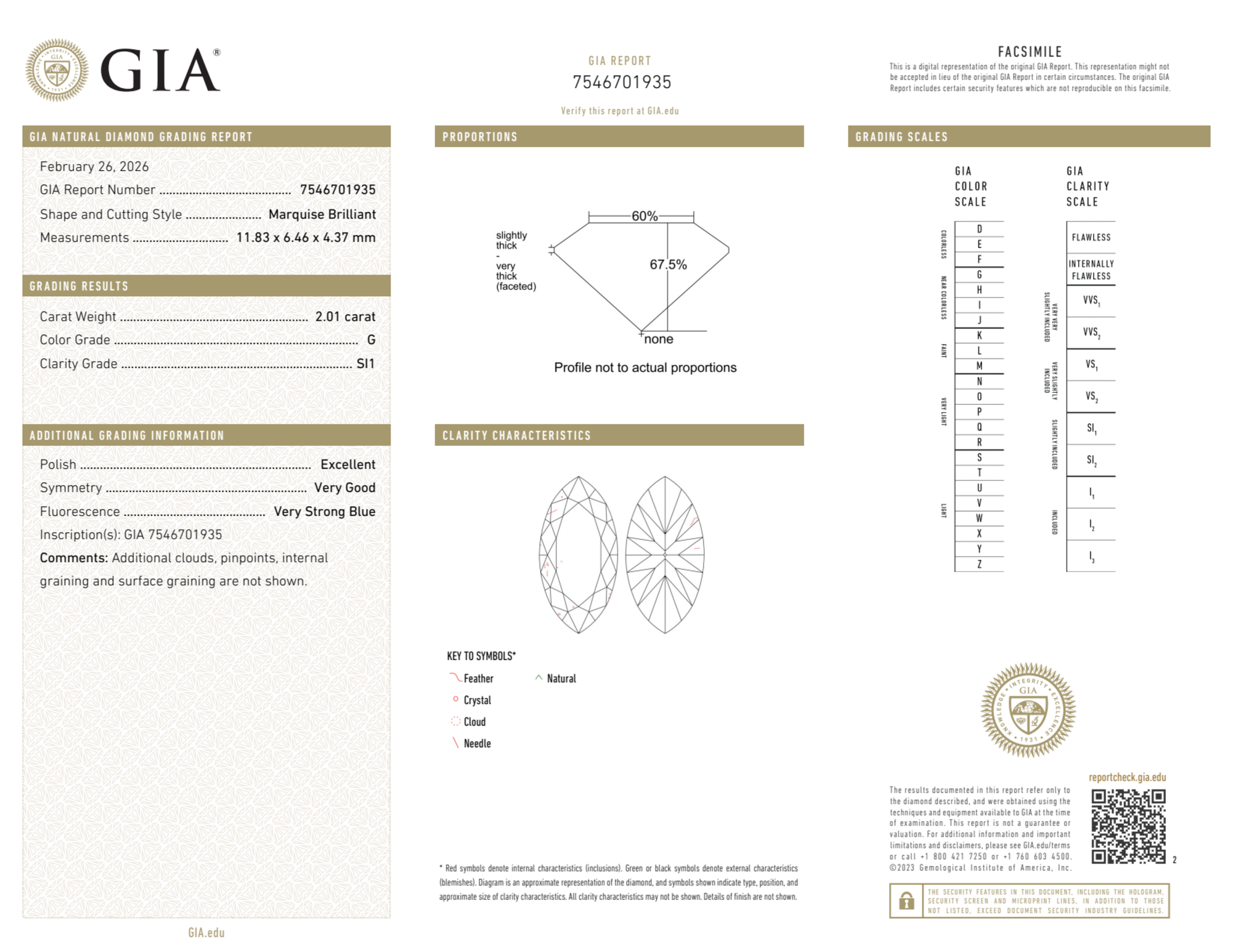 Your 2.01 carat Marquise natural diamond is graded SI1 clarity, which stands for Slightly Included 1. Read more about SI1 clarity diamonds here, or learn more about diamond clarity in general here.