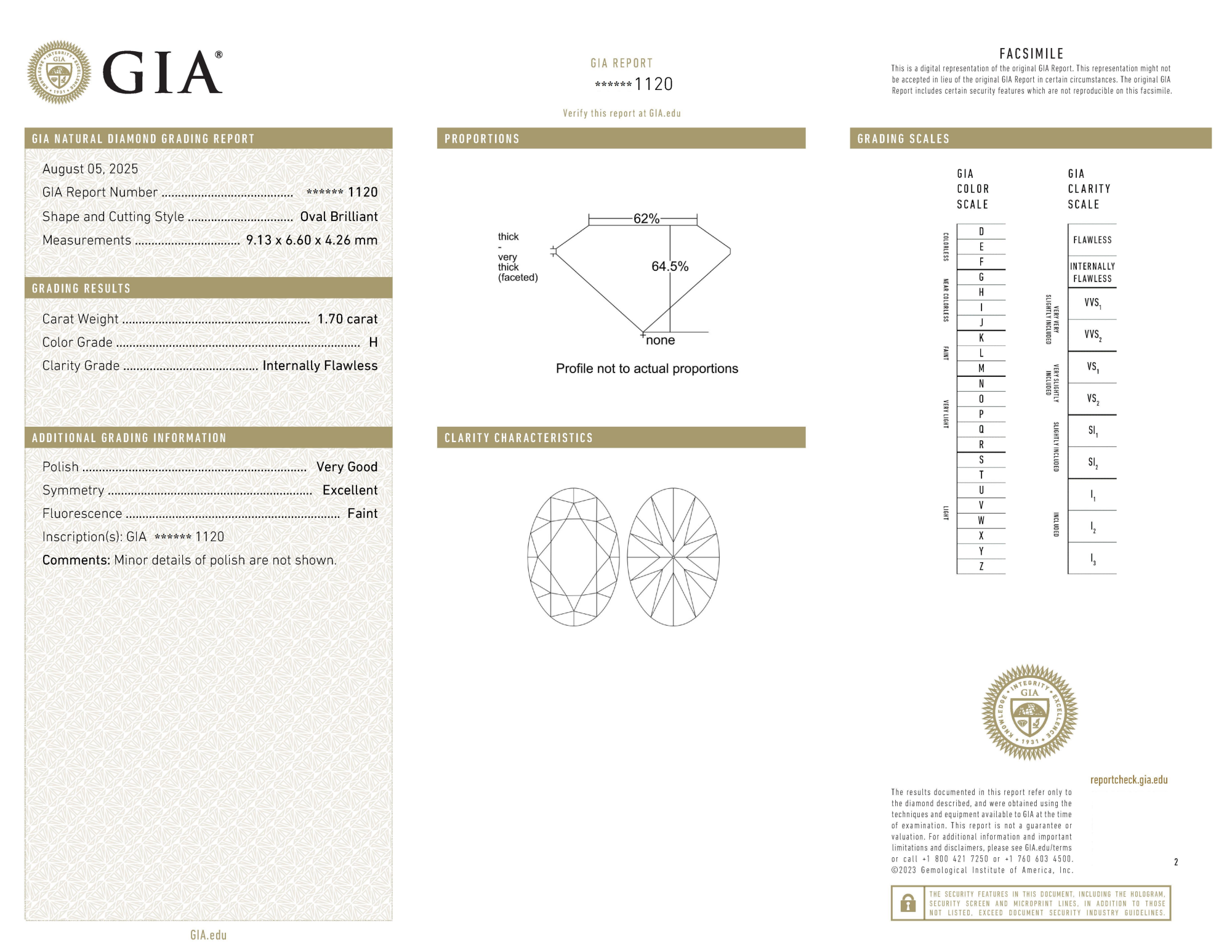 Your 1.70 carat Oval natural diamond is graded IF clarity, which stands for Internally Flawless. Read more about IF clarity diamonds here, or learn more about diamond clarity in general here.