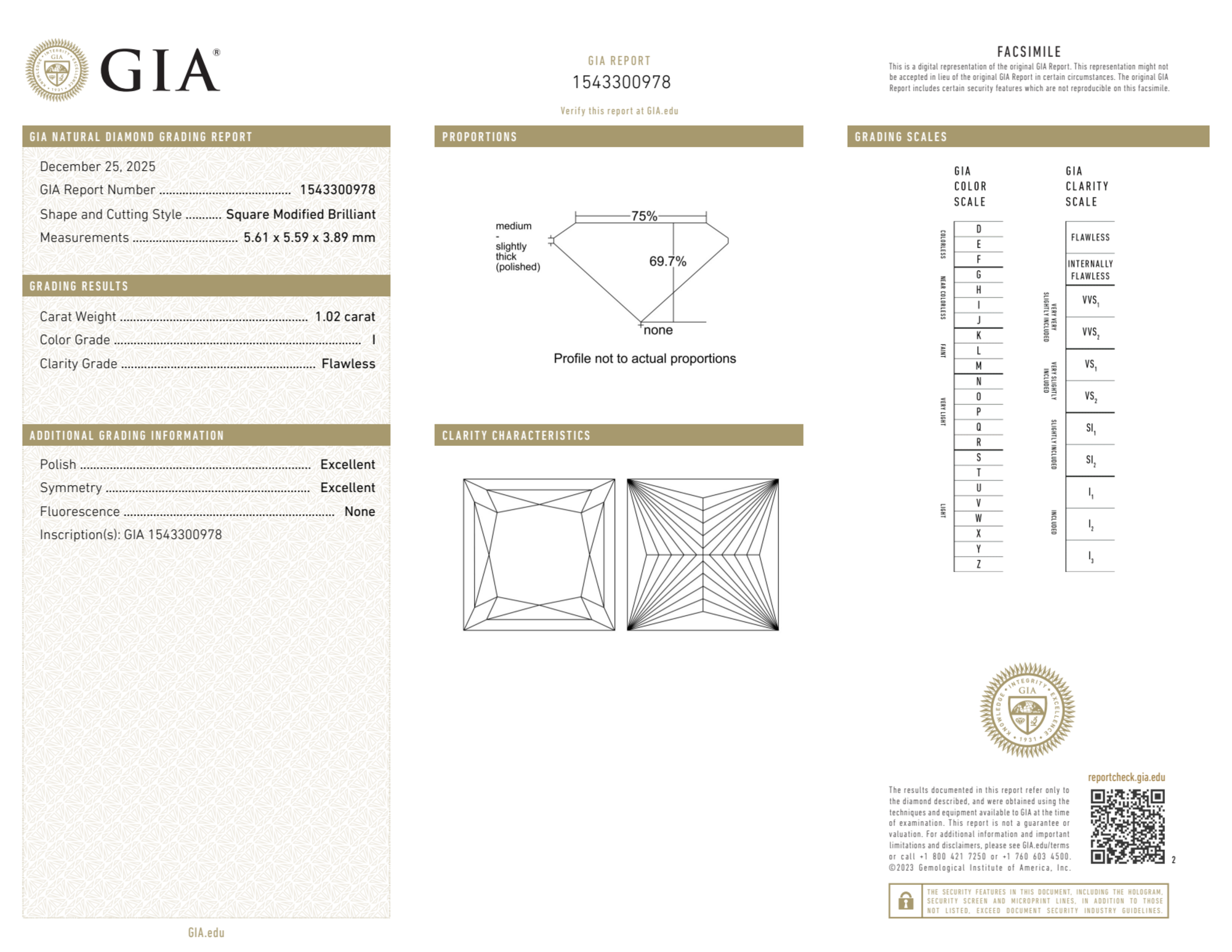 Your 1.02 carat Princess natural diamond is graded FL clarity, which stands for Flawless. Read more about FL clarity diamonds here, or learn more about diamond clarity in general here.