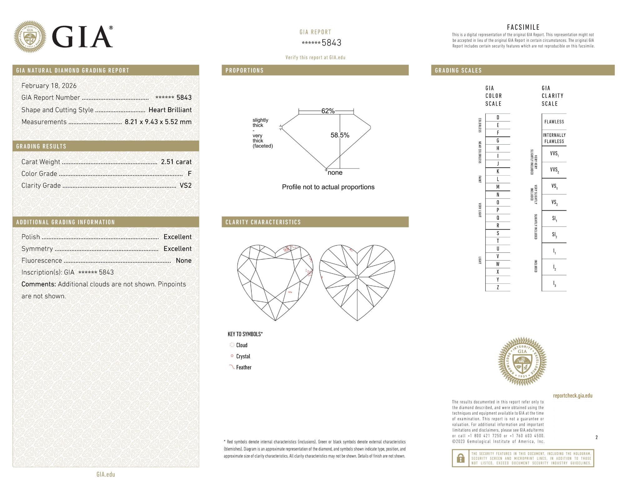 Your 2.51 carat Heart natural diamond is graded VS2 clarity, which stands for Very Slightly Included 2. Read more about VS2 clarity diamonds here, or learn more about diamond clarity in general here.