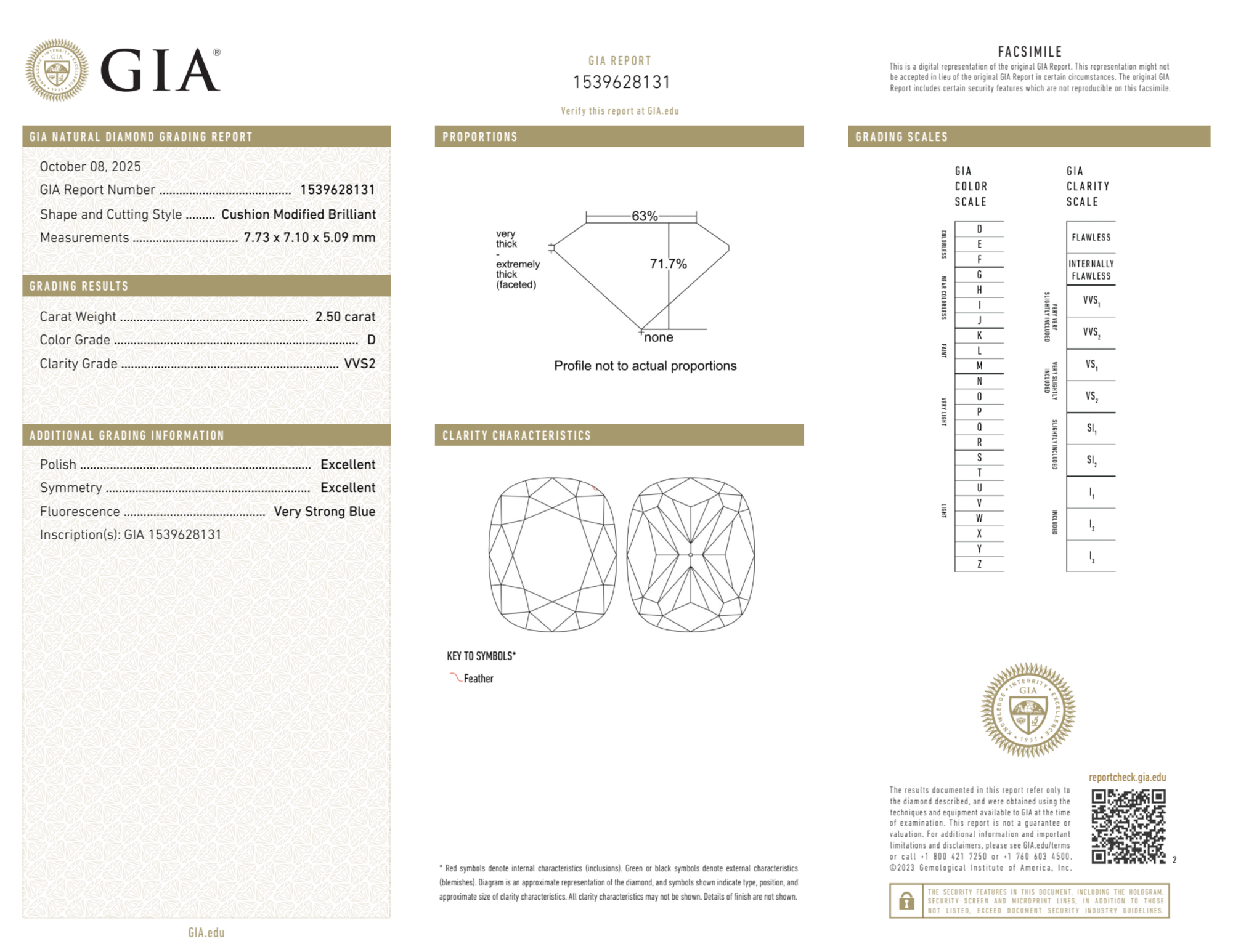 Your 2.50 carat Cushion natural diamond is graded D color (Colorless), and you can read more about D color diamonds here.